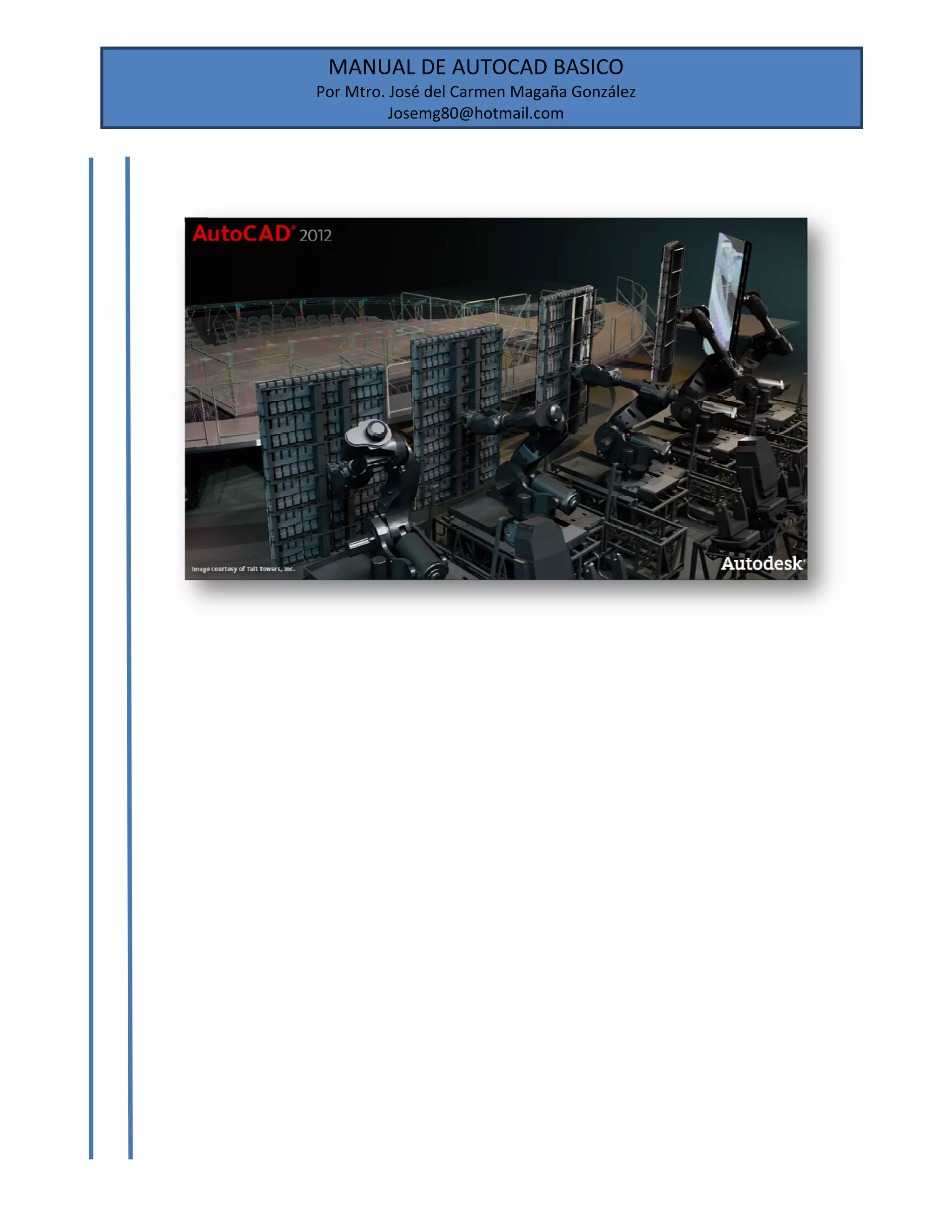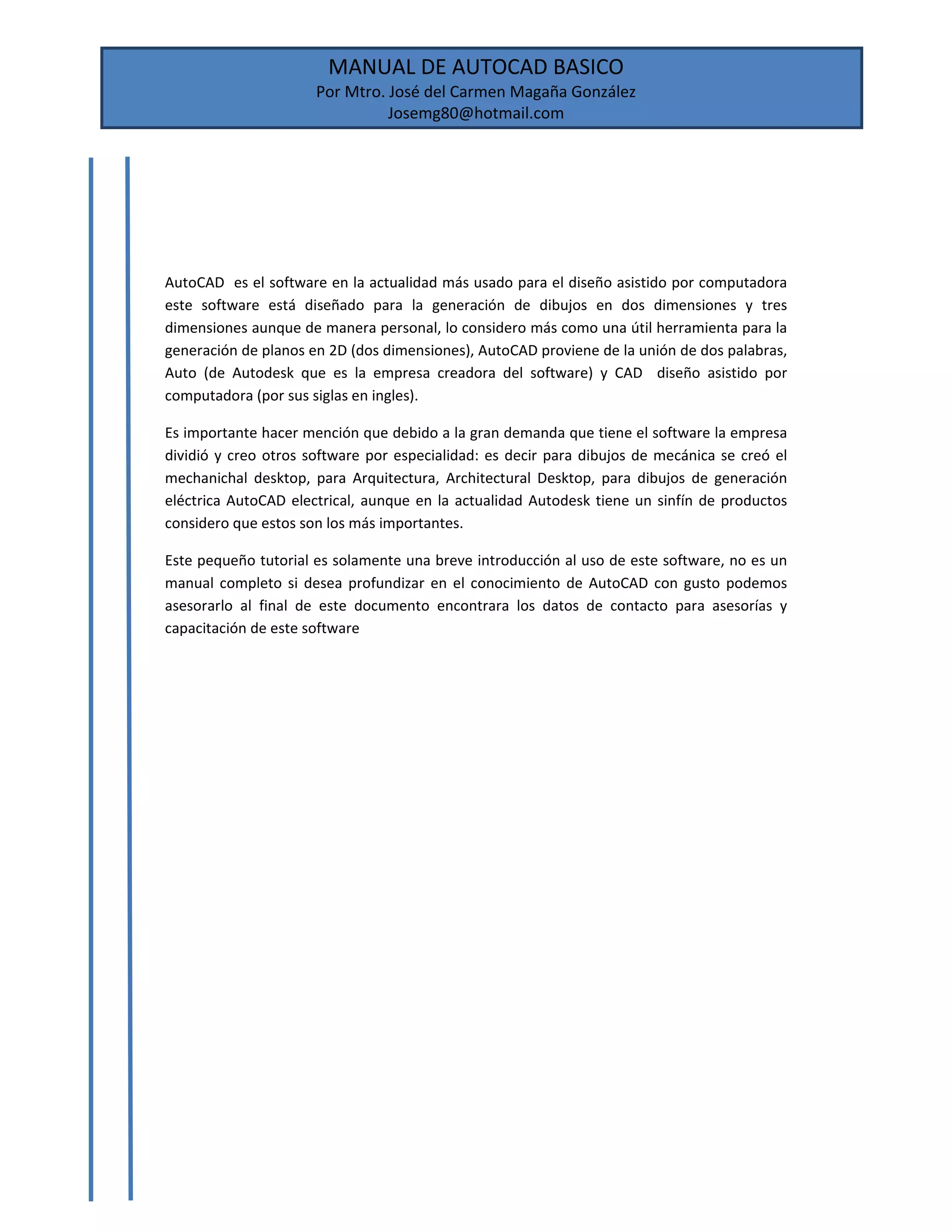 El documento es un manual básico de AutoCAD creado por el Mtro. José del Carmen Magaña González, que presenta el software como una herramienta para el diseño asistido por computadora. Se destacan su uso para generar dibujos en dos y tres dimensiones, y se introducen conceptos fundamentales como las coordenadas cartesianas y polares, además de ofrecer ejercicios prácticos para el usuario. Al final, se invita a los lectores a solicitar asesoría adicional a través de un correo electrónico.