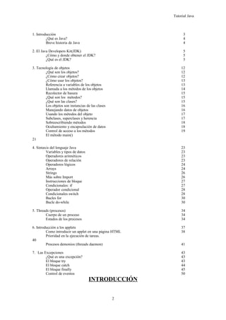 Este documento proporciona una introducción al lenguaje de programación Java. Explica brevemente la historia y el propósito de Java, y describe las principales herramientas del Java Development Kit (JDK), incluido el compilador Javac y el intérprete Java. También cubre conceptos básicos de programación orientada a objetos en Java como clases, objetos y métodos.