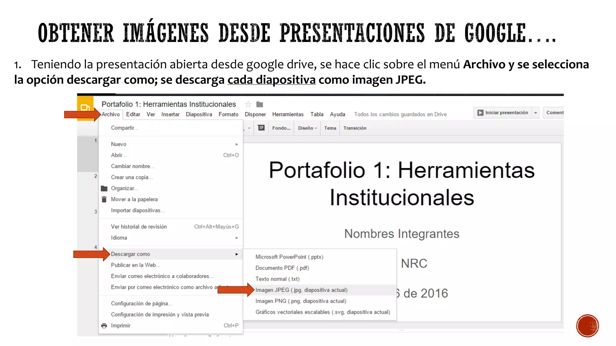 El documento describe los pasos para crear un video a partir de diapositivas de presentación y publicarlo en un blog institucional. Estos pasos incluyen: 1) descargar las diapositivas como imágenes JPEG, 2) crear el video en Kizoa agregando las imágenes, 3) previsualizar y guardar el video, 4) copiar el código de inserción del video, 5) pegar el código en la entrada de herramientas institucionales del blog, y 6) publicar el enlace del blog en un curso virtual.