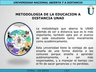 El documento describe la metodología de educación a distancia de la Universidad Nacional Abierta y a Distancia de Colombia (UNAD), la cual enseña de forma autónoma y responsable. Explica las diferencias entre aprendizaje autónomo, el cual implica desarrollar habilidades propias para aprender de manera crítica, y autoaprendizaje, que se refiere a adquirir habilidades de manera constante y aplicada de forma independiente. Finalmente, concluye que los estudiantes son más heterogéneos y que los recursos digital