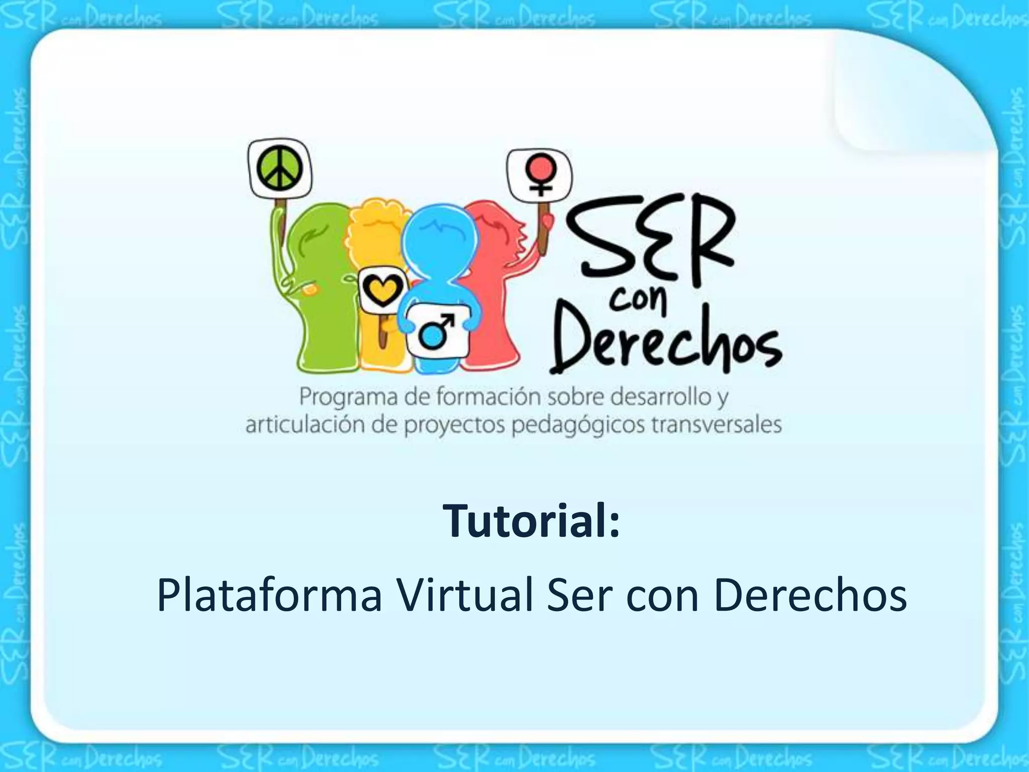 Este documento proporciona instrucciones sobre cómo acceder y navegar a través de la Plataforma Virtual Ser con Derechos. Explica que los usuarios deben ingresar la dirección URL didactica.udea.edu.co/scd e ingresar sus credenciales de usuario y contraseña. Luego, los usuarios hacen clic en el nombre de su grupo y tienen acceso al contenido de cada fase, incluidos videos, agendas, foros, wikis y chats para completar las actividades de forma virtual u online. El documento también proporciona