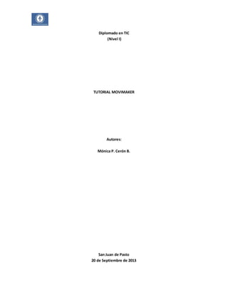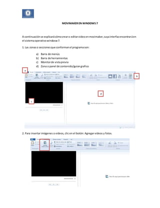 Este documento explica los pasos para crear y editar videos en Movimaker en Windows 7. Describe las diferentes secciones del programa como la barra de menús, barra de herramientas, monitor de vista previa y panel de contenido. Explica cómo insertar videos, imágenes, títulos, transiciones, efectos, música y narración. También cubre cómo editar la duración de los elementos, moverlos, dividir videos y guardar el proyecto final en un formato de video compatible.
