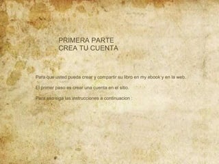 Este documento proporciona instrucciones para crear y publicar un libro electrónico en la plataforma myebook.com en 3 pasos: 1) Crear una cuenta, 2) Subir o editar el libro electrónico utilizando las herramientas en el sitio, y 3) Publicar el libro electrónico. Explica cómo crear una cuenta, agregar contenido como texto e imágenes, y publicar el libro electrónico de manera que otros usuarios puedan acceder a él.