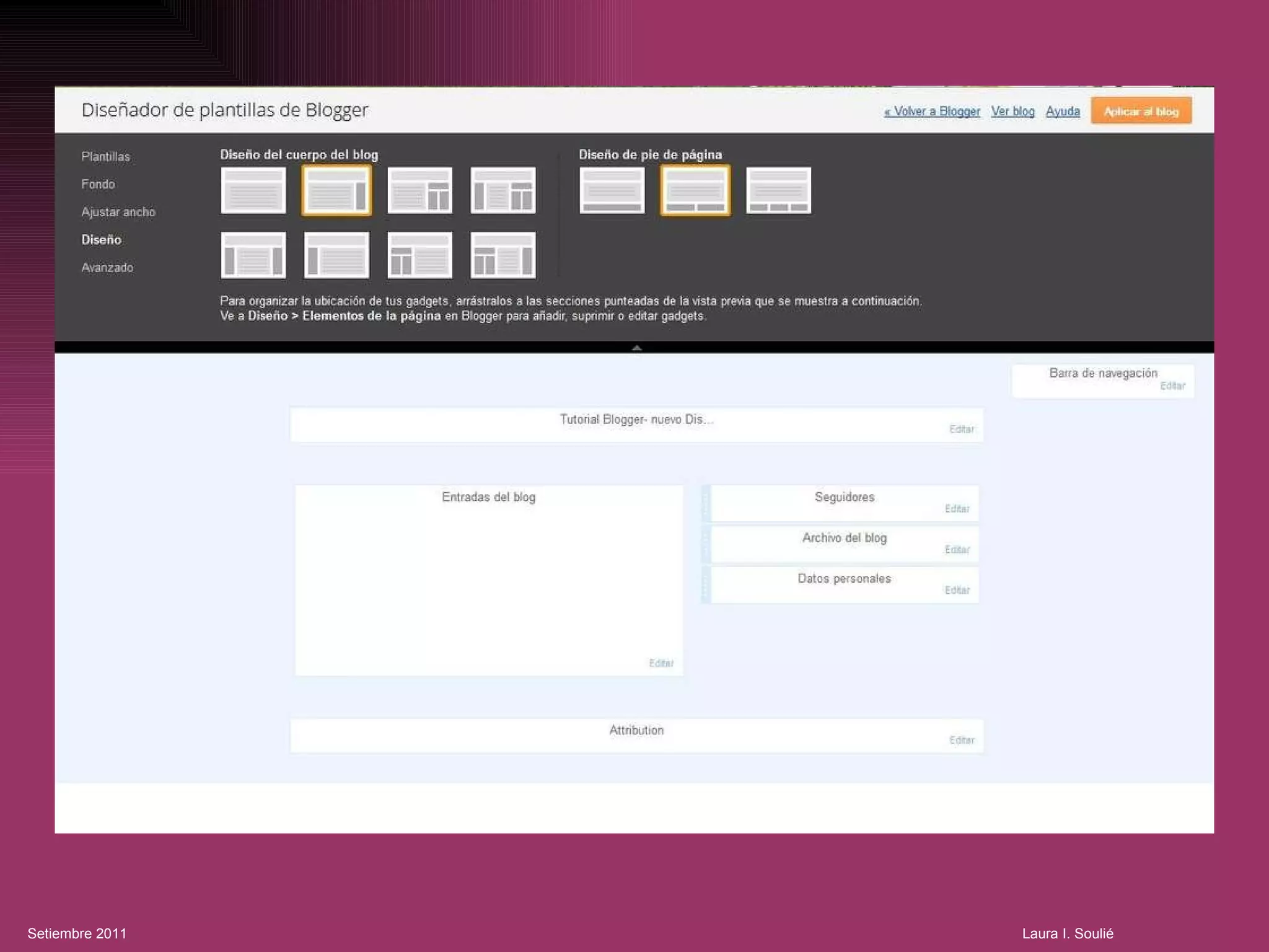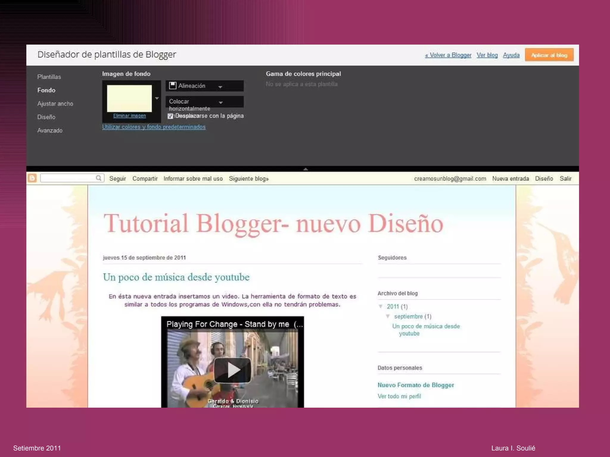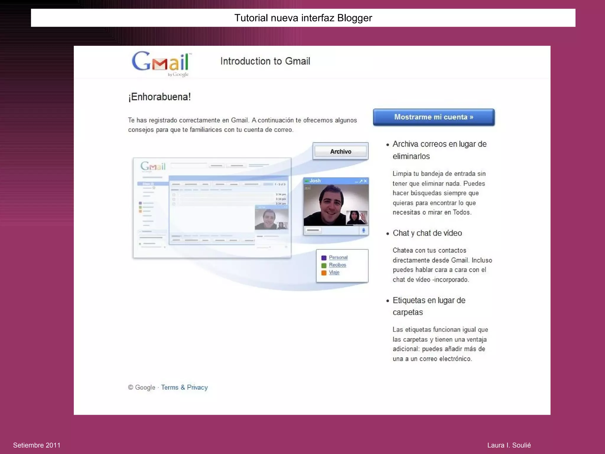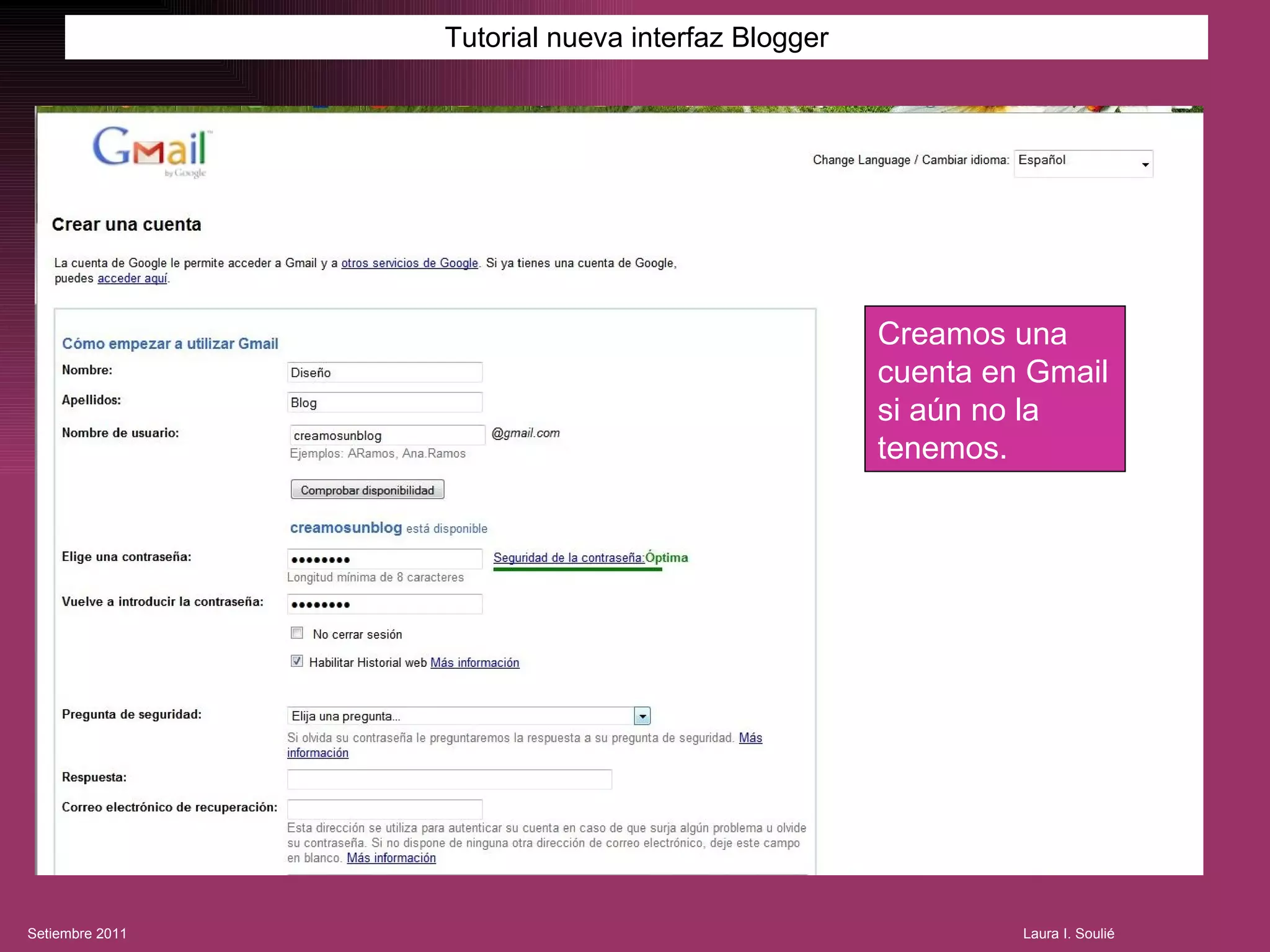 Este documento proporciona instrucciones para crear una cuenta de Blogger y un blog nuevo. Explica que los usuarios deben crear una cuenta de Gmail si no tienen una, registrarse en blogger.com usando sus credenciales de Gmail, seleccionar una plantilla inicial, y luego podrán comenzar a trabajar en su blog recién creado. También menciona que los elementos de configuración y diseño son similares a la interfaz anterior de Blogger.