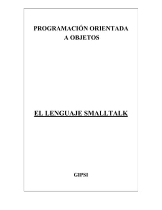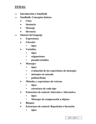 Este documento presenta conceptos básicos de programación orientada a objetos y del lenguaje Smalltalk, incluyendo clases, instancias, mensajes, herencia, sintaxis de Smalltalk, y tipos de expresiones como literales, variables, mensajes y bloques. Explica conceptos como clase, instancia, mensaje, herencia, y cómo la programación en Smalltalk consiste en crear clases, instancias y especificar secuencias de mensajes entre objetos.