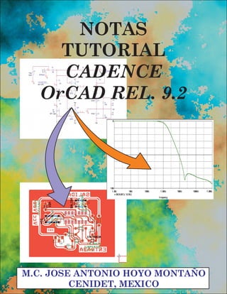 Este documento proporciona una guía de usuario para el software de diseño electrónico Cadence OrCAD rel. 9.2. Incluye instrucciones para la captura de esquemáticos, la creación de modelos, librerías y símbolos, y el uso de fuentes de señal. El documento contiene cuatro capítulos y cubre temas como la interfaz de usuario, el diseño de circuitos planos y jerárquicos, y la simulación de circuitos.