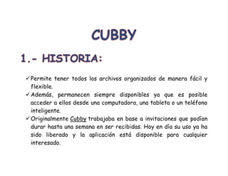 Cubby permite organizar archivos de manera fácil y flexible y acceder a ellos desde cualquier dispositivo. Originalmente requería invitaciones pero ahora está disponible para cualquier usuario interesado. Ofrece 5GB de almacenamiento gratuito en la nube.