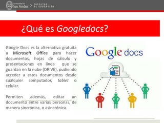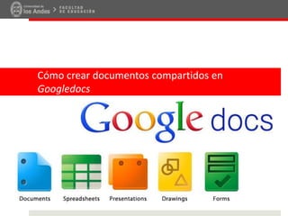 Este documento explica los 11 pasos para crear y compartir documentos compartidos en Google Docs: 1) Renombrar el documento, 2) Ubicarlo en una carpeta, 3) Compartir el documento mediante la obtención de un enlace URL, 4) Configurar el enlace para permitir ediciones. Google Docs permite a múltiples usuarios editar documentos de forma sincrónica u asincrónica desde cualquier dispositivo a través de la nube.