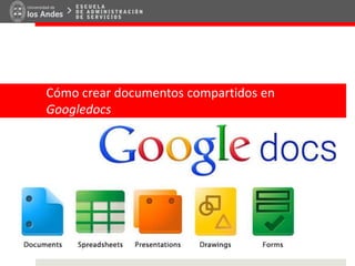 Este documento explica cómo crear documentos compartidos en Google Docs. En primer lugar, describe brevemente qué es Google Docs y sus funciones principales de edición en línea y colaboración. Luego, detalla los pasos para crear un nuevo documento, incluyendo darle nombre, archivarlo en una carpeta compartida y configurar las opciones de edición y acceso para que otros usuarios puedan editarlo. Finalmente, explica cómo copiar y compartir el enlace del documento para que otros puedan acceder a él.