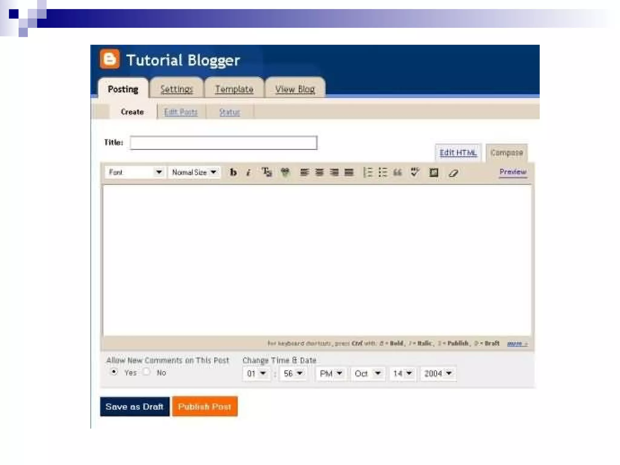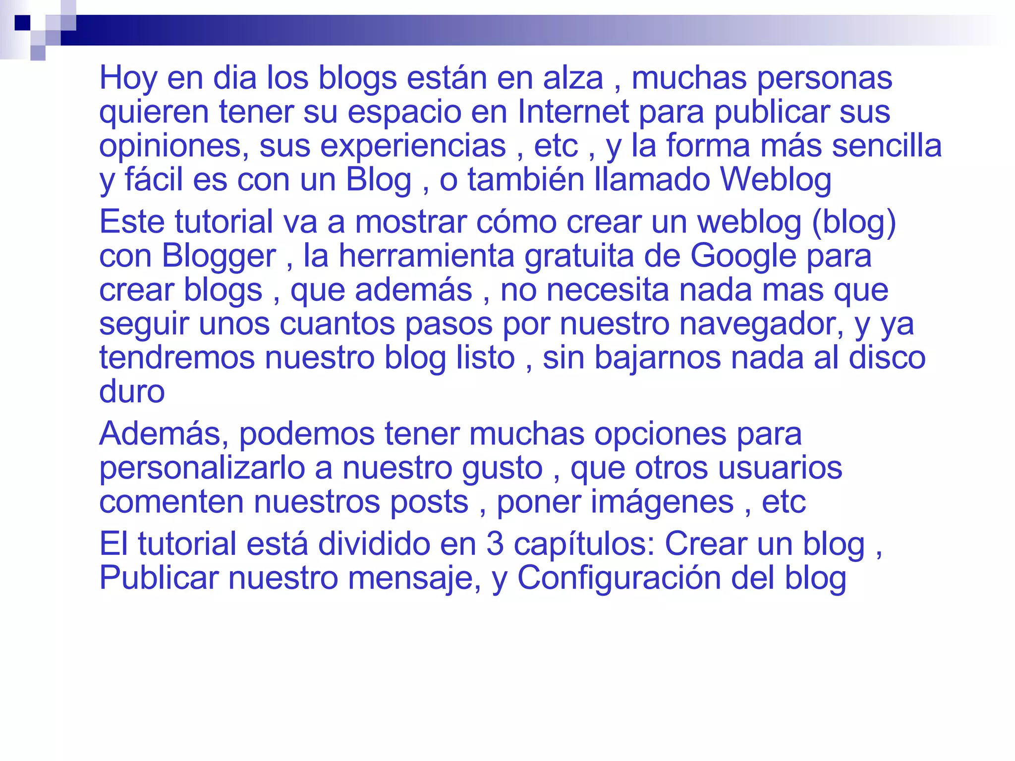 Este documento proporciona un tutorial paso a paso para crear un blog gratuito en blogger.com. Explica cómo registrarse en la plataforma, elegir un nombre y diseño para el blog, publicar el primer post, y configurar opciones básicas como los comentarios. El proceso solo requiere seguir unos sencillos pasos en el navegador sin necesidad de descargar software.