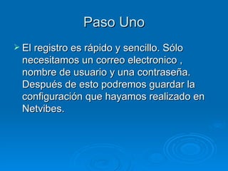 Este documento presenta un tutorial en 5 pasos para el uso de la plataforma Netvibes. El primer paso explica cómo crear una cuenta con correo electrónico, nombre de usuario y contraseña. El segundo paso describe cómo configurar rápidamente la página principal y desactivar la publicidad. El tercer paso explica que una cuenta está dividida en secciones y widgets que muestran aplicaciones, páginas web o feeds, y que se pueden crear nuevas secciones y páginas. El cuarto paso cubre la configuración de temas, idioma, fondo y
