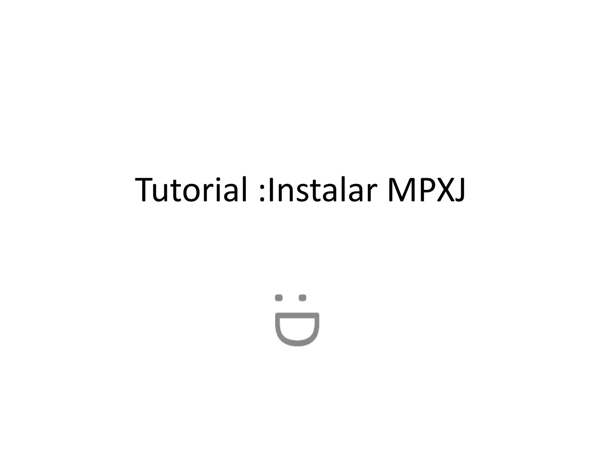 El documento es un tutorial sobre cómo instalar MPXJ y configurar JDK y Apache Ant. Se instruye al usuario a crear variables de sistema como JAVA_HOME y ANT_HOME, y agregar rutas al PATH. También se detallan los pasos para descomprimir MPXJ, modificar archivos de configuración y ejecutar comandos en la línea de comandos.