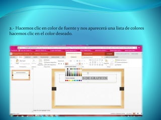 Este documento proporciona instrucciones en 13 pasos para utilizar PowerPoint en línea. Explica cómo ingresar a PowerPoint en línea, elegir un diseño, insertar diapositivas nuevas o duplicadas, centrar o alinear texto, cambiar la fuente, tamaño y color del texto, agregar relleno de texto, insertar imágenes, aplicar estilos de imagen, restablecer estilos de imagen, cambiar imágenes y proporciona una bibliografía.
