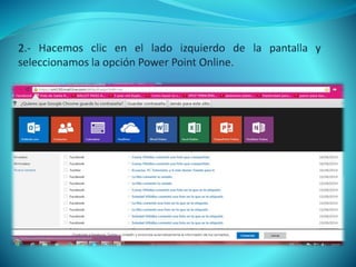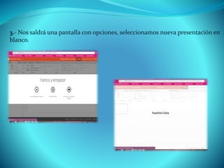 Este documento proporciona instrucciones en 13 pasos para utilizar PowerPoint en línea. Explica cómo ingresar a PowerPoint en línea, elegir un diseño, insertar diapositivas nuevas o duplicadas, centrar o alinear texto, cambiar la fuente, tamaño y color del texto, agregar relleno de texto, insertar imágenes, aplicar estilos de imagen, restablecer estilos de imagen, cambiar imágenes y proporciona una bibliografía.