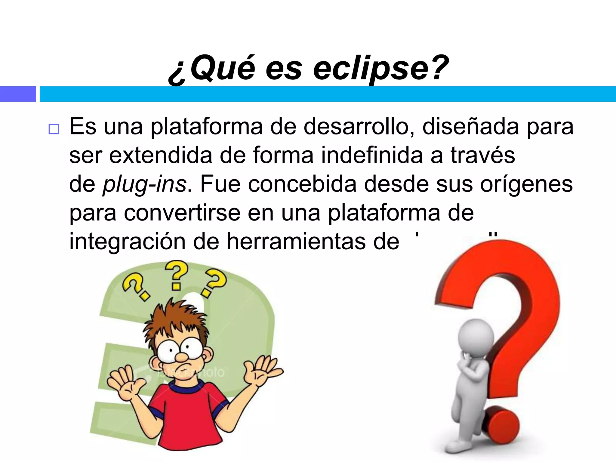 Eclipse es una plataforma de desarrollo que puede extenderse a través de complementos. Se diseñó originalmente para ser una plataforma integradora de herramientas de desarrollo. Eclipse se usa para crear y editar proyectos de software en Java y guarda cada archivo y código compilado de un proyecto. Ofrece funciones como crear nuevos archivos, proyectos y paquetes, así como abrir, guardar y cerrar archivos.