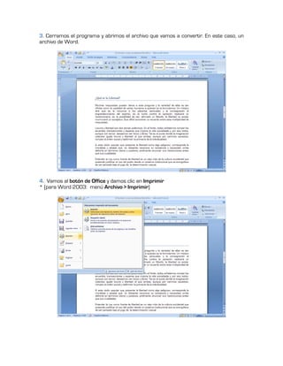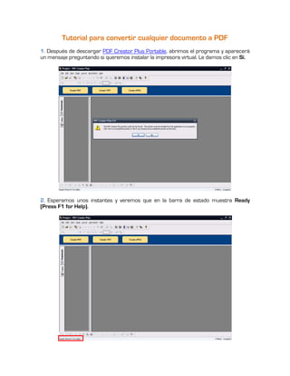 Este documento proporciona un tutorial en 11 pasos para convertir cualquier documento a formato PDF utilizando el programa gratuito PDF Creator Plus Portable. El tutorial explica cómo instalar la impresora virtual PDF Creator Plus, imprimir documentos de Word u otros formatos a dicha impresora para generar archivos PDF, y guardarlos con un nombre asignado.