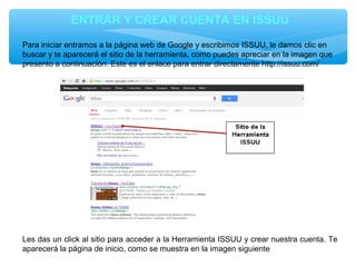 Este documento proporciona instrucciones para crear una cuenta en Issuu y publicar documentos. Explica cómo acceder al sitio web de Issuu, crear una cuenta gratuita con correo electrónico, cargar y publicar un documento, obtener el enlace y código de incorporación de la publicación, y descargar el documento publicado.