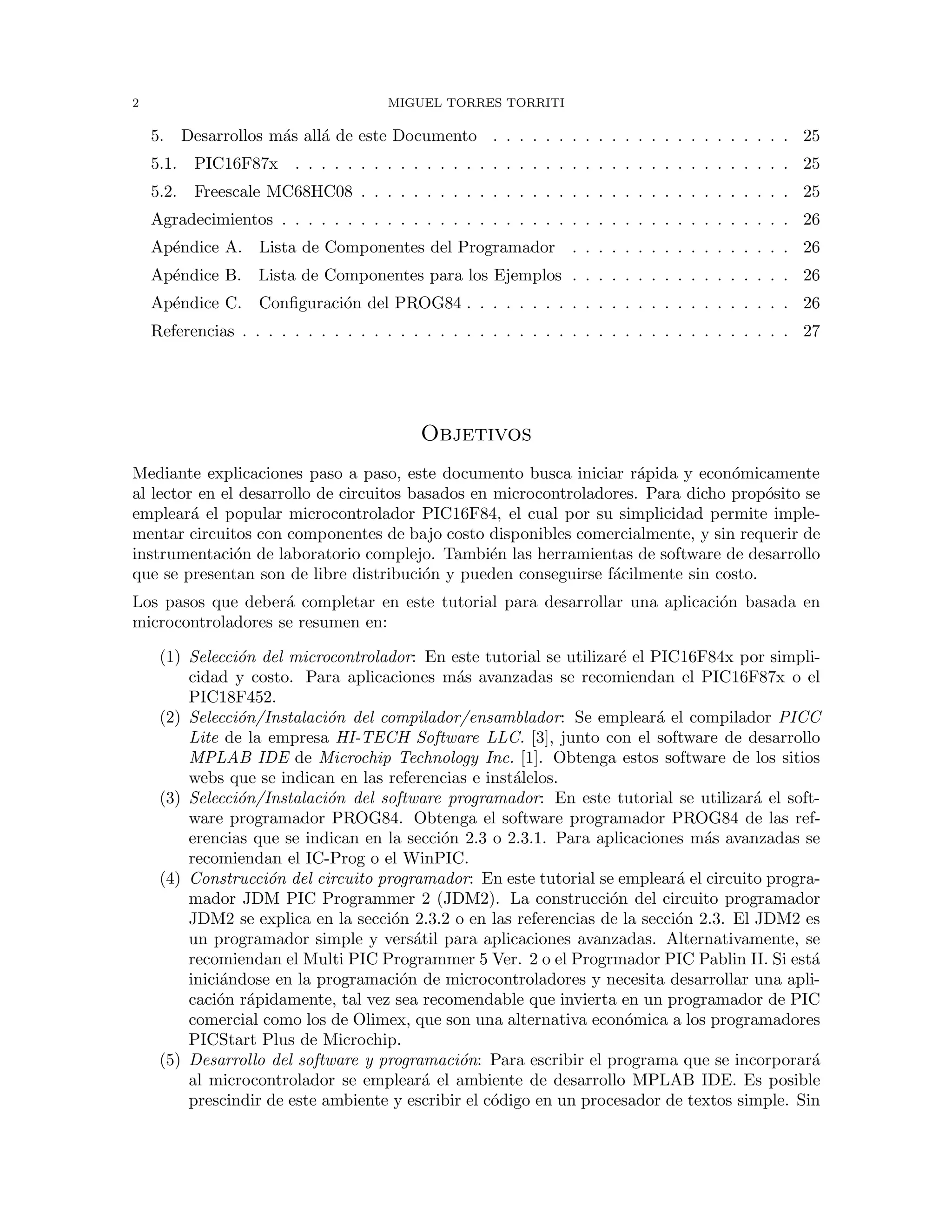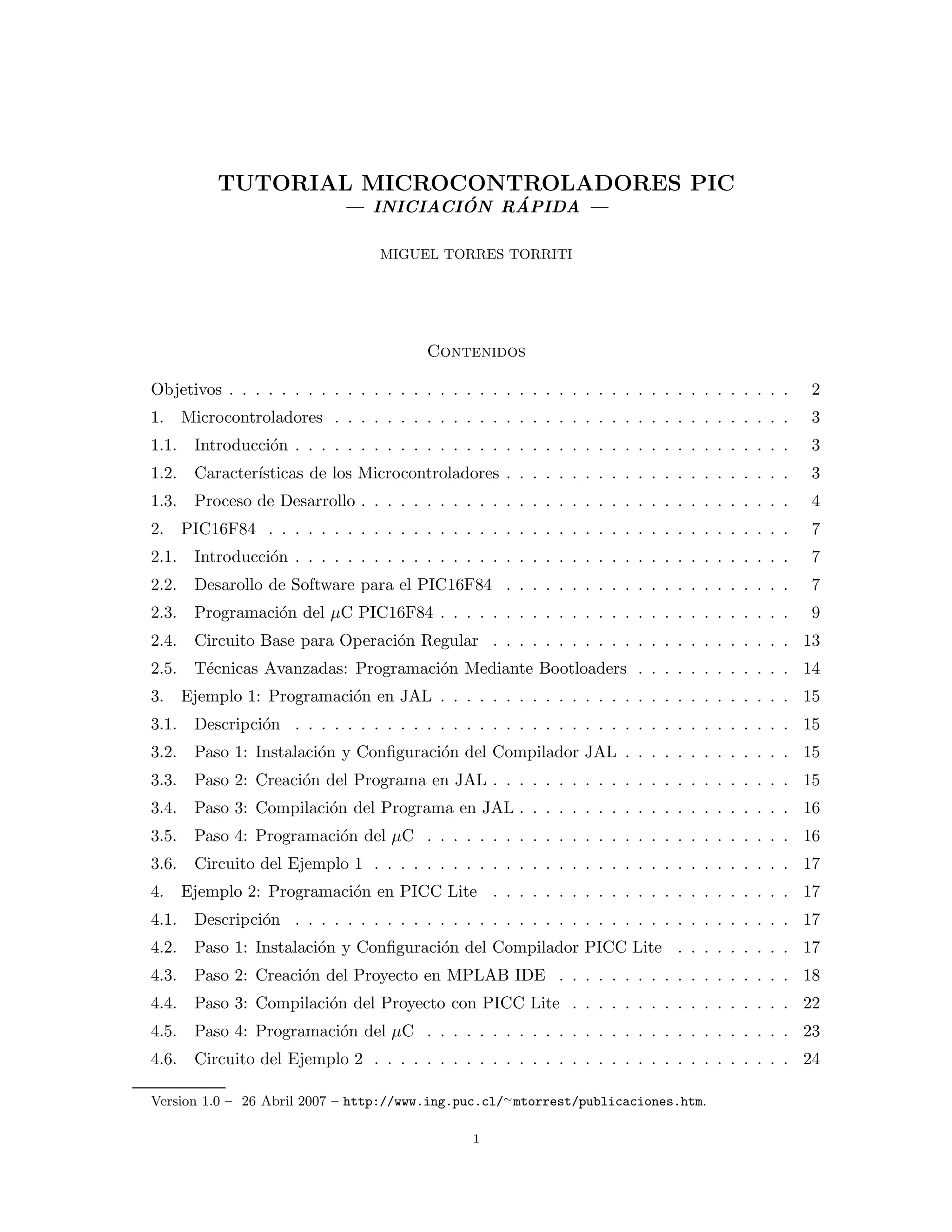 Este documento presenta un tutorial sobre microcontroladores PIC. Explica el proceso de desarrollo de aplicaciones basadas en microcontroladores, incluyendo la selección del microcontrolador PIC16F84, la instalación de herramientas de software como el compilador PICC Lite y el programador PROG84, y la construcción de un circuito programador. Luego, provee dos ejemplos completos que muestran cómo programar el PIC16F84 usando los compiladores JAL y PICC Lite.