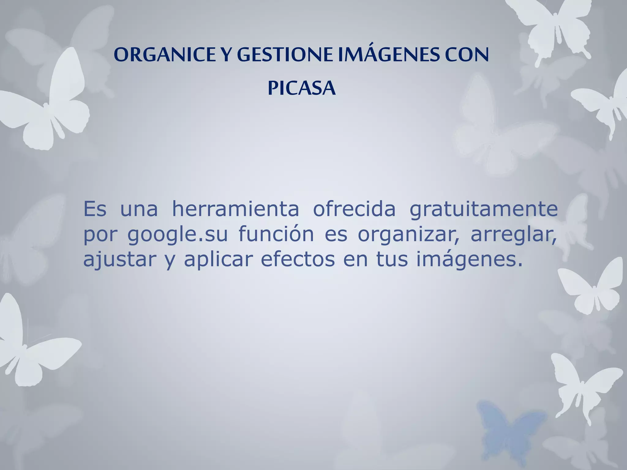 El documento es un tutorial sobre cómo organizar y gestionar imágenes usando Picasa, una herramienta gratuita de Google. Proporciona instrucciones detalladas sobre la descarga, instalación y uso de Picasa, incluyendo funciones como recortar, enderezar imágenes y aplicar efectos. Además, describe cómo crear y compartir álbumes en línea a través de una cuenta de Gmail.