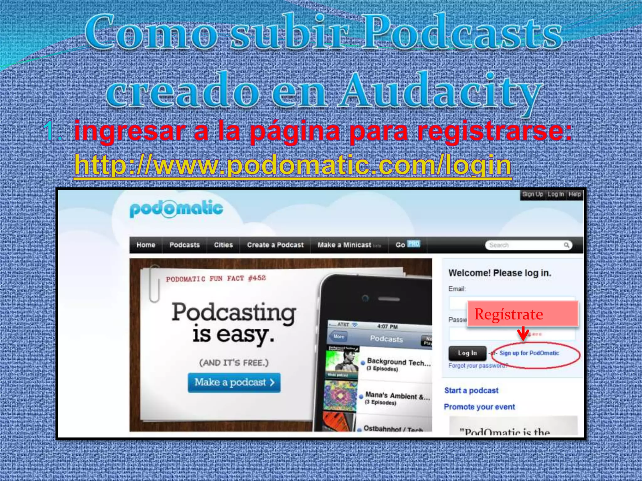 Este documento proporciona un tutorial de 14 pasos para subir un podcast creado en Audacity a la plataforma Podomatic. Los pasos incluyen registrarse en Podomatic, llenar un formulario de inscripción, subir una imagen, agregar un título y descripción, cargar el archivo de audio, agregar tags y continuar la publicación. Finalmente, se proporciona el código HTML para insertar el podcast en un blog.