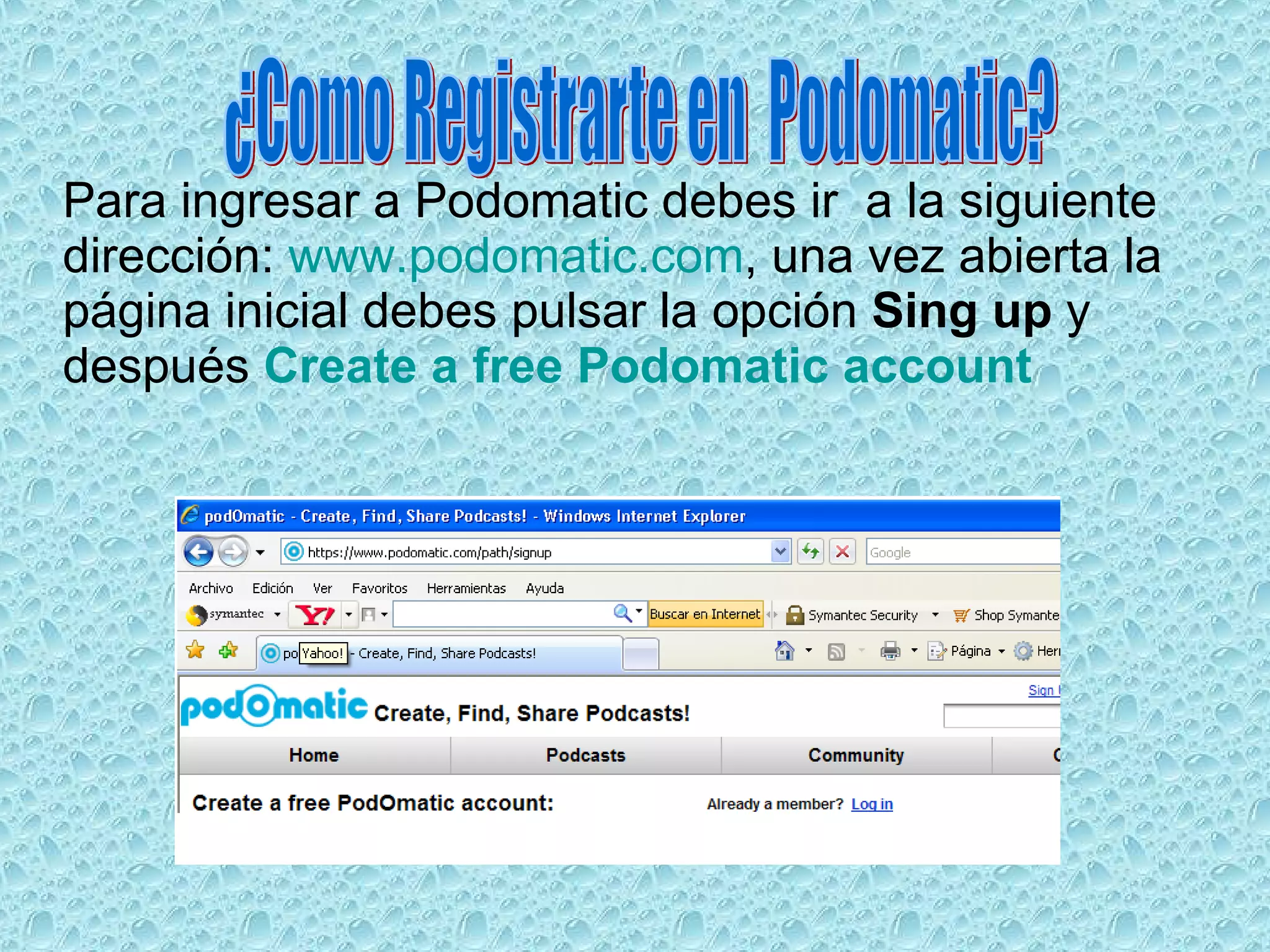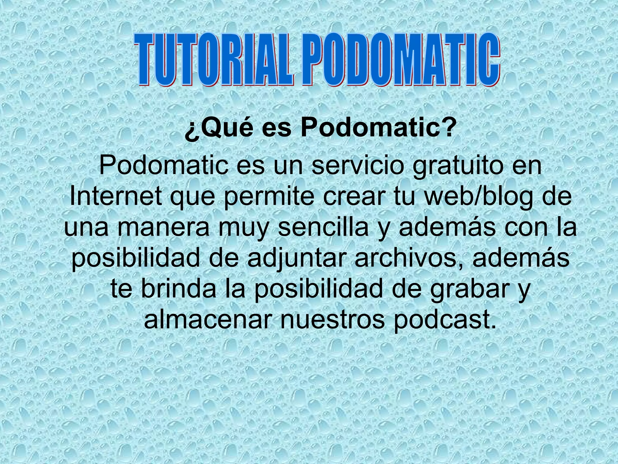 Podomatic es un servicio gratuito en internet que permite crear un blog o página web de forma sencilla, con posibilidad de agregar archivos y grabar podcasts. Para crear una cuenta, el usuario ingresa sus datos personales y elige una dirección para su blog, luego carga una imagen y archivos de audio, y agrega palabras clave. Una vez creado, el usuario puede reproducir y compartir sus podcasts a través de su página de Podomatic.
