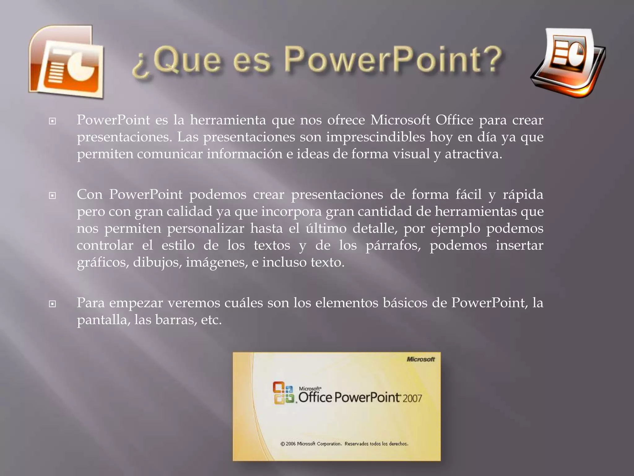 Este documento proporciona una introducción a las funciones básicas de Microsoft PowerPoint. Explica los elementos clave de la interfaz como las barras de título, acceso rápido y opciones. También describe cómo crear y guardar presentaciones, insertar y eliminar diapositivas, y utilizar diferentes vistas como la vista normal.