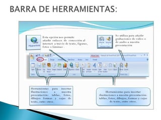 El documento describe cómo usar Microsoft PowerPoint para crear presentaciones de diapositivas que incluyan texto, imágenes y otros elementos multimedia. Se mencionan diversas herramientas y opciones, como elegir diseños, insertar imágenes, y cambiar formatos de texto. Además, se explica el proceso de guardar la presentación en diferentes formatos.