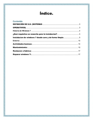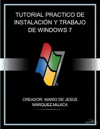 Este documento proporciona instrucciones para instalar y usar Windows 7. Explica cómo instalar Windows 7 de forma limpia, incluidos los pasos y configuraciones requeridas como idioma, zona horaria, nombre de usuario y contraseña. También describe las partes principales del entorno de Windows 7 como el escritorio, barra de tareas y menú Inicio, así como actividades básicas y mantenimiento del sistema.