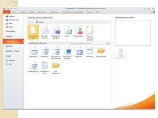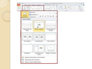 Este documento proporciona información sobre cómo utilizar Microsoft PowerPoint 2010. Explica las diferentes pestañas y grupos de la cinta de opciones y sus funciones, como crear y guardar presentaciones, insertar diapositivas y objetos multimedia, aplicar temas y transiciones, y ver una presentación. También incluye instrucciones sobre cómo imprimir diapositivas e insertar y enlazar videos.