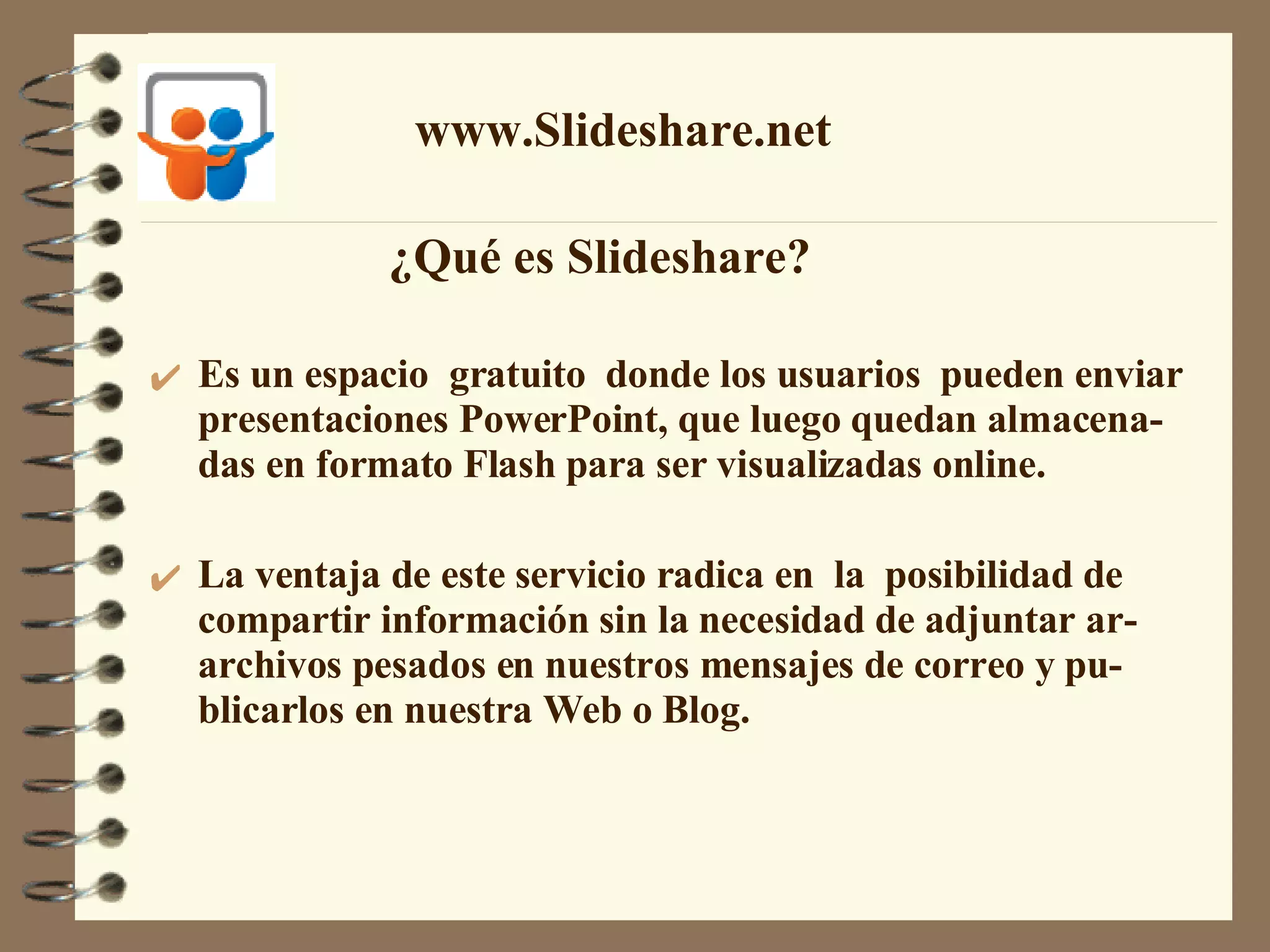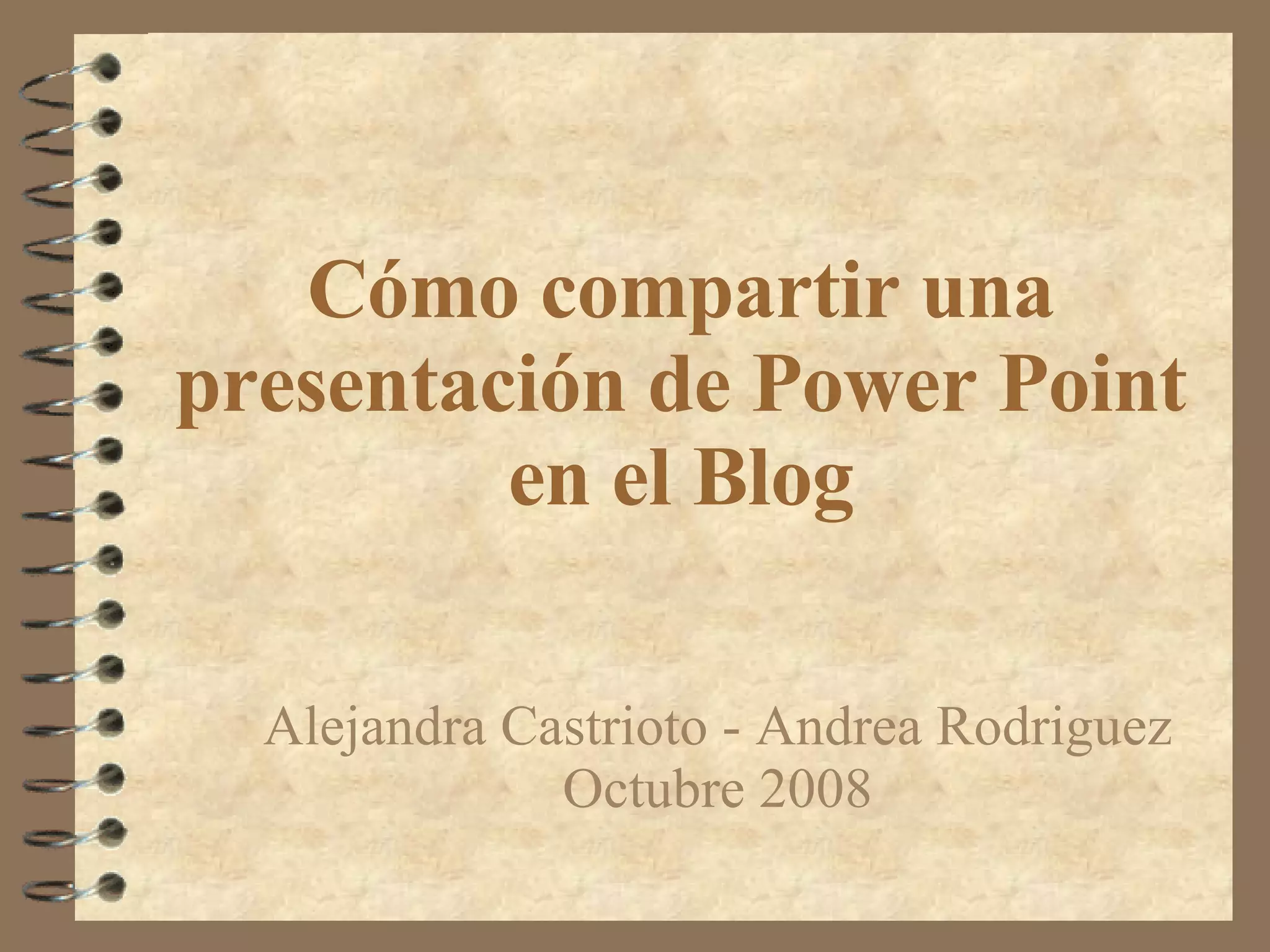 Este documento explica cómo compartir una presentación de PowerPoint en un blog usando el servicio Slideshare. Slideshare permite subir presentaciones en formato Flash para verlas en línea de forma gratuita. El documento detalla los pasos para crear una cuenta en Slideshare, subir la presentación, y luego insertar el código embed en un blog para publicar la presentación.