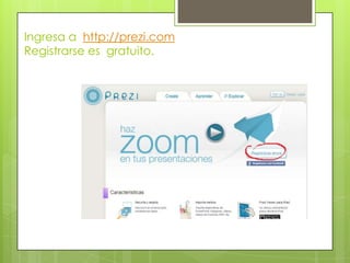 Este documento proporciona instrucciones en 12 pasos para crear presentaciones en Prezi, incluyendo registrarse en prezi.com de forma gratuita, elegir una plantilla y editar los recuadros/diapositivas insertando texto, imágenes, video u otros elementos, y personalizar la presentación con temas, formatos y diseños antes de guardar y compartir el trabajo finalizado.