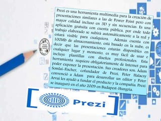 El documento es un tutorial que guía a los usuarios a través del proceso de creación de una cuenta en Prezi, incluyendo la selección de plantilla y la personalización de presentaciones. Instruye sobre cómo añadir contenido, utilizar herramientas de zoom y guardar temas personalizados. Finalmente, proporciona información sobre cómo presentar y compartir las presentaciones creadas.