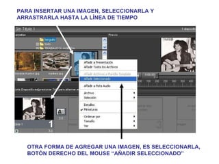 El documento proporciona instrucciones para crear videos con el software ProShow Producer 4.0. Explica cómo agregar imágenes y archivos de audio a la línea de tiempo, aplicar efectos como zoom y capas a las imágenes, seleccionar efectos de transición, y finalmente crear y guardar el video final.