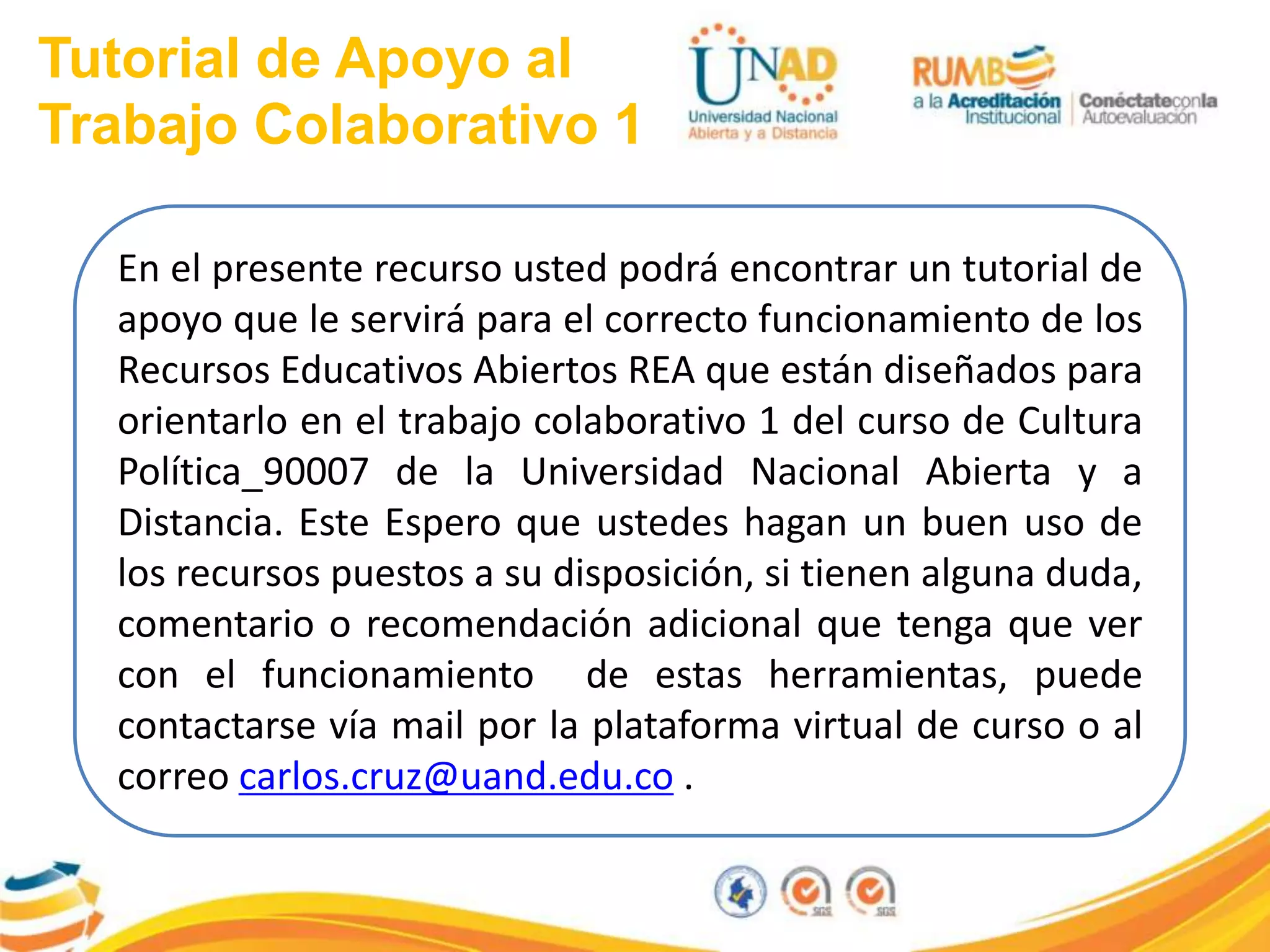 El documento presenta un tutorial para orientar el trabajo colaborativo 1 del curso de Cultura Política de la Universidad Nacional Abierta y a Distancia. Incluye información sobre recursos educativos abiertos diseñados para apoyar el trabajo colaborativo, así como enlaces a una página Glogster con más detalles. Se alienta a los estudiantes a hacer buen uso de los recursos y a comunicarse con el tutor si tienen dudas o comentarios.