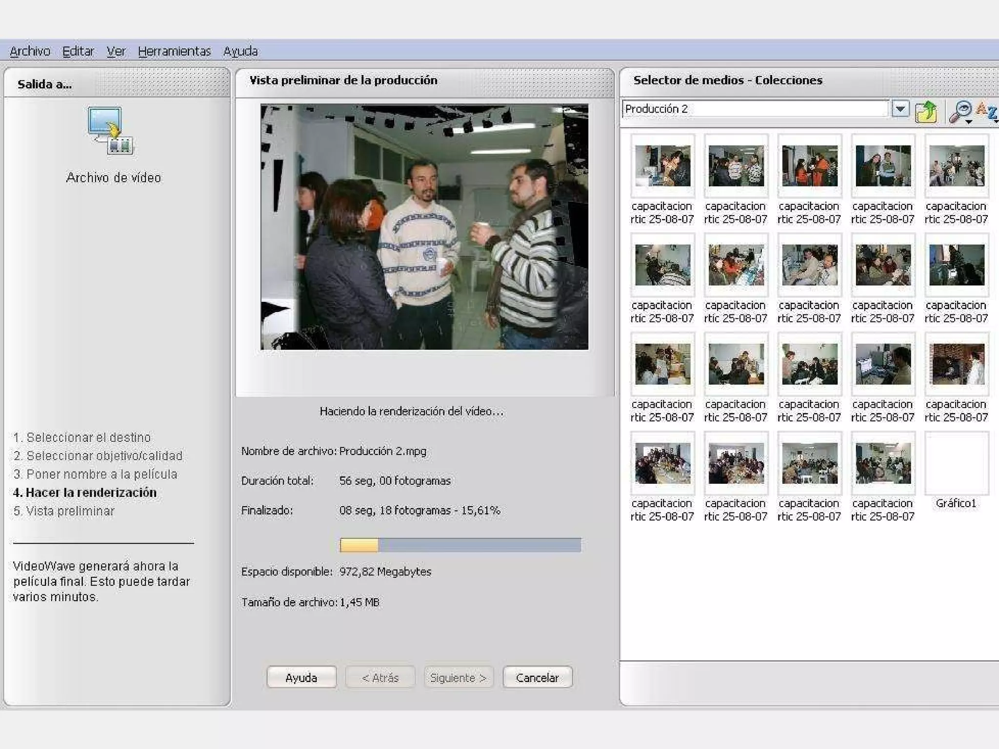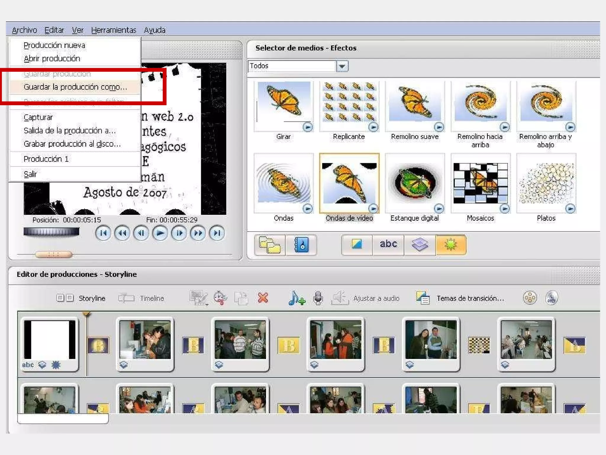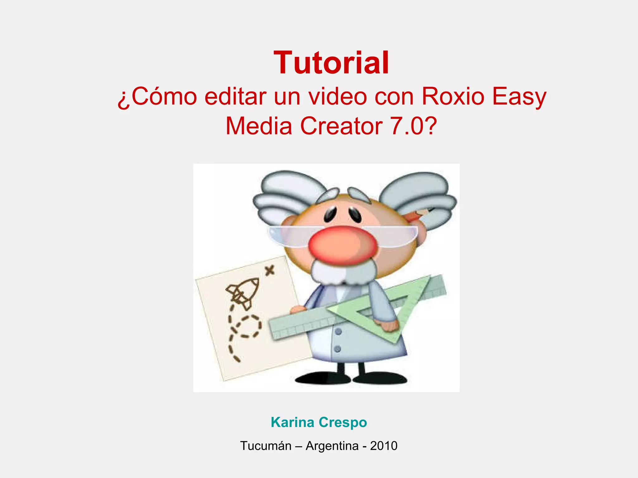 Este documento proporciona un tutorial paso a paso para editar un video utilizando el software Roxio Easy Media Creator 7.0. Explica cómo importar imágenes y videos, agregar transiciones, texto, efectos y audio, y exportar el proyecto terminado como un video que puede ser reproducido en otros reproductores. El tutorial contiene 16 pasos que van desde la apertura del programa y selección de archivos multimedia hasta la exportación final del video y su almacenamiento automático en la carpeta "Mis videos".