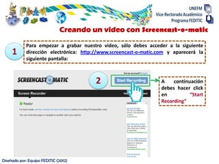 Este documento proporciona instrucciones paso a paso para crear un video utilizando la herramienta Screencast-o-matic. Explica cómo acceder al sitio web de Screencast-o-matic, iniciar la grabación de la pantalla, agregar una presentación u otro contenido, finalizar la grabación y luego publicar el video en YouTube u optar por guardarlo localmente en la computadora.