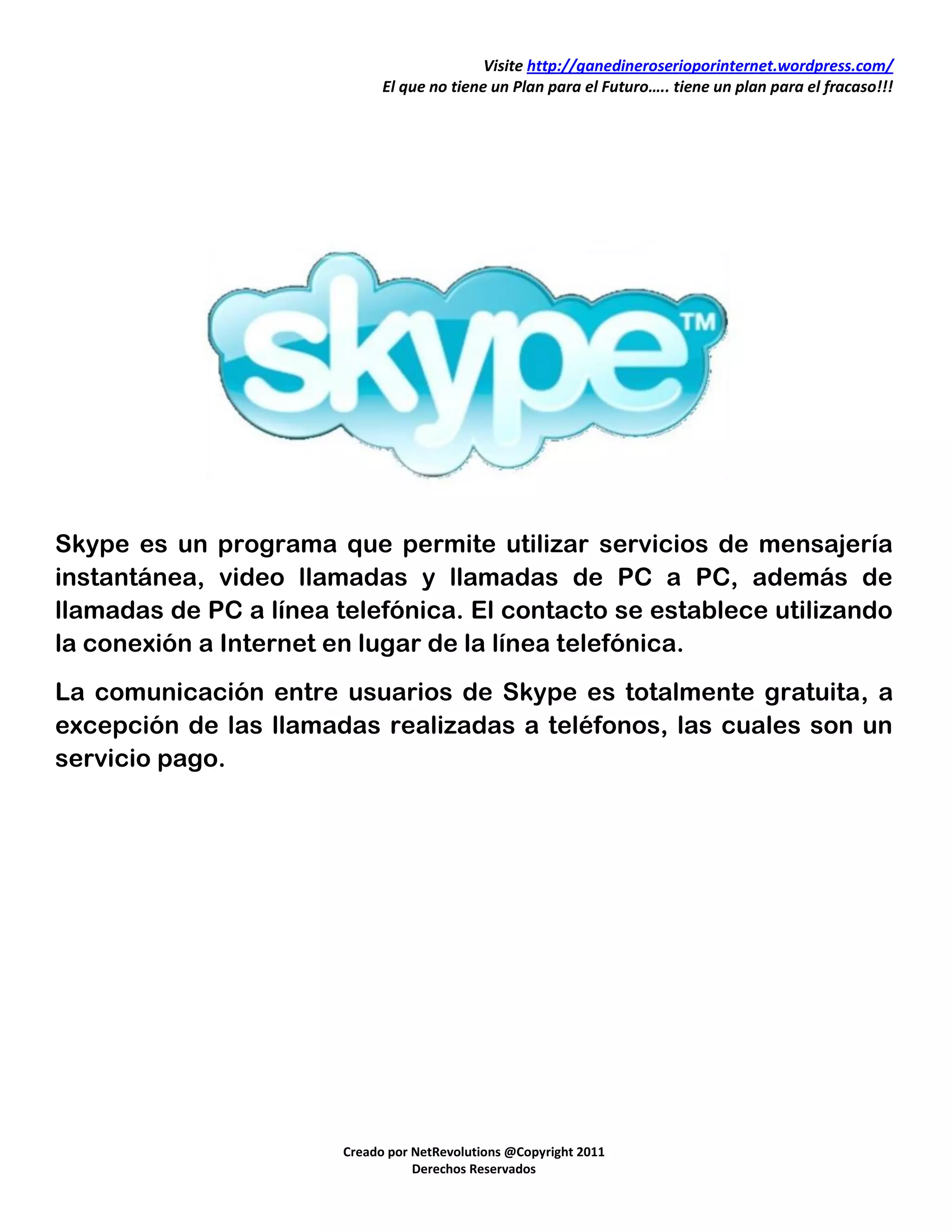 El documento proporciona instrucciones sobre cómo descargar e instalar el programa Skype para realizar llamadas de voz y video gratuitas a través de Internet. Explica los pasos para crear una cuenta, agregar contactos, iniciar conversaciones individuales o grupales, y compartir archivos.