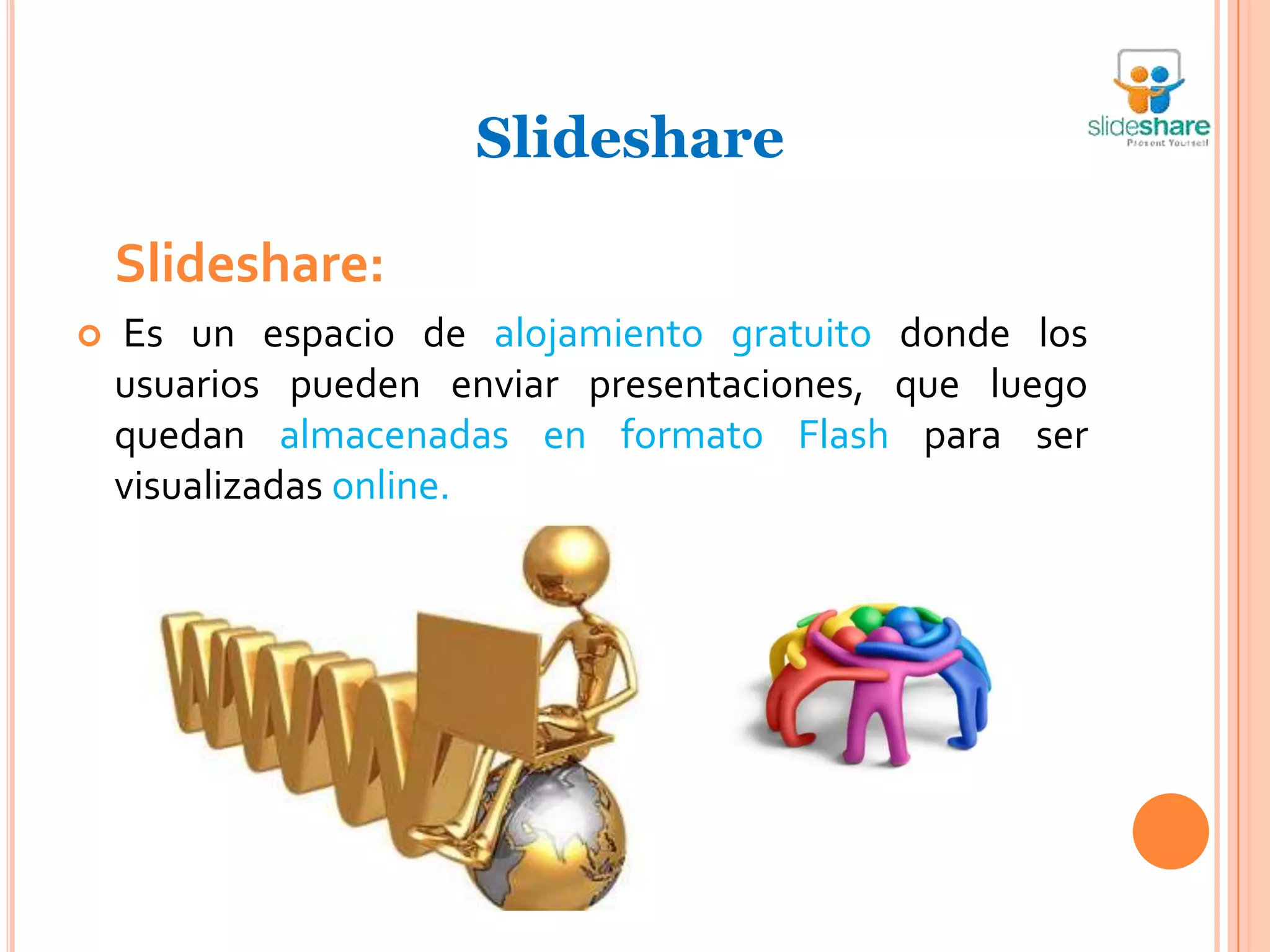 Slideshare es un sitio web gratuito donde los usuarios pueden subir presentaciones en formato Flash para compartirlas en línea. Los usuarios deben crear una cuenta, luego pueden cargar presentaciones de hasta 100MB creadas en PowerPoint u OpenOffice. Una vez subidas, las presentaciones se convierten a formato Flash y están disponibles para que otros usuarios las vean online.