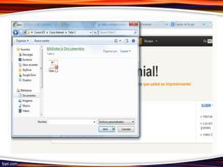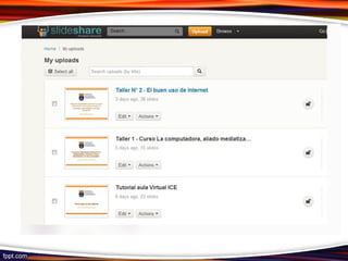 Slideshare es la comunidad más grande del mundo para compartir presentaciones y contenidos. Los usuarios pueden subir archivos de presentaciones, documentos, archivos PDF y videos de manera pública o privada. Se puede acceder a presentaciones subidas por otros usuarios sobre cualquier tema. Para empezar en Slideshare, los usuarios se registran con su cuenta de Facebook o correo electrónico y luego suben sus presentaciones agregando un título, descripción y etiquetas antes de publicarlas de manera pública o privada.