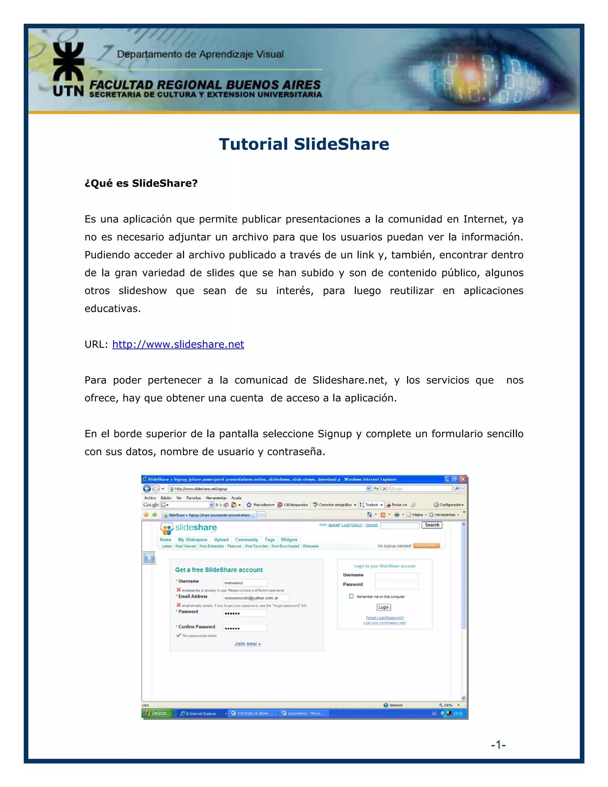SlideShare es una aplicación que permite publicar presentaciones en línea de manera gratuita. Los usuarios pueden crear una cuenta, subir sus propias presentaciones en formatos como PowerPoint, PDF y otros. También pueden buscar presentaciones de otros usuarios usando etiquetas o palabras clave. Las presentaciones se pueden compartir en blogs u otros sitios web insertando código HTML.