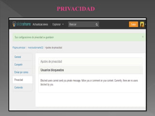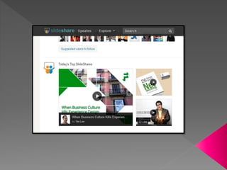 SlideShare es un servicio web que permite a usuarios publicar, ver y compartir presentaciones. Los usuarios pueden crear una cuenta en SlideShare cargando sus presentaciones y datos personales. Una vez creada la cuenta, los usuarios pueden subir presentaciones al sitio web examinando y seleccionando los archivos en su computadora. SlideShare también permite a los usuarios incrustar presentaciones en blogs copiando el código HTML provisto.