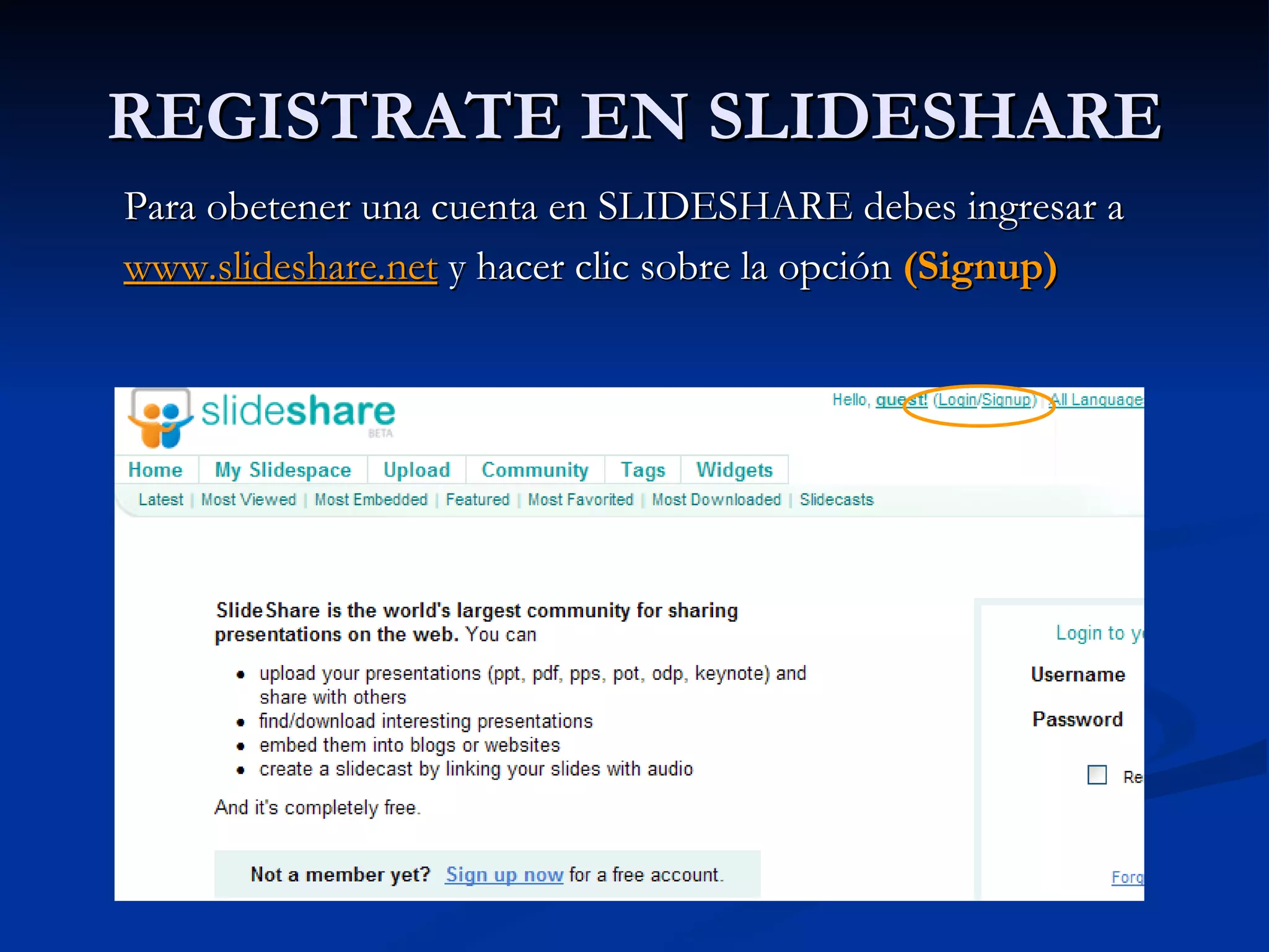 Slidshare es una herramienta que permite a los usuarios subir presentaciones, añadirles títulos, descripciones y etiquetas, y compartirlas a través de enlaces web y correo electrónico. El documento proporciona instrucciones paso a paso sobre cómo registrarse en Slidshare, completar el perfil de usuario, cargar una presentación y publicarla para que otros usuarios puedan verla y navegar entre sus diapositivas.