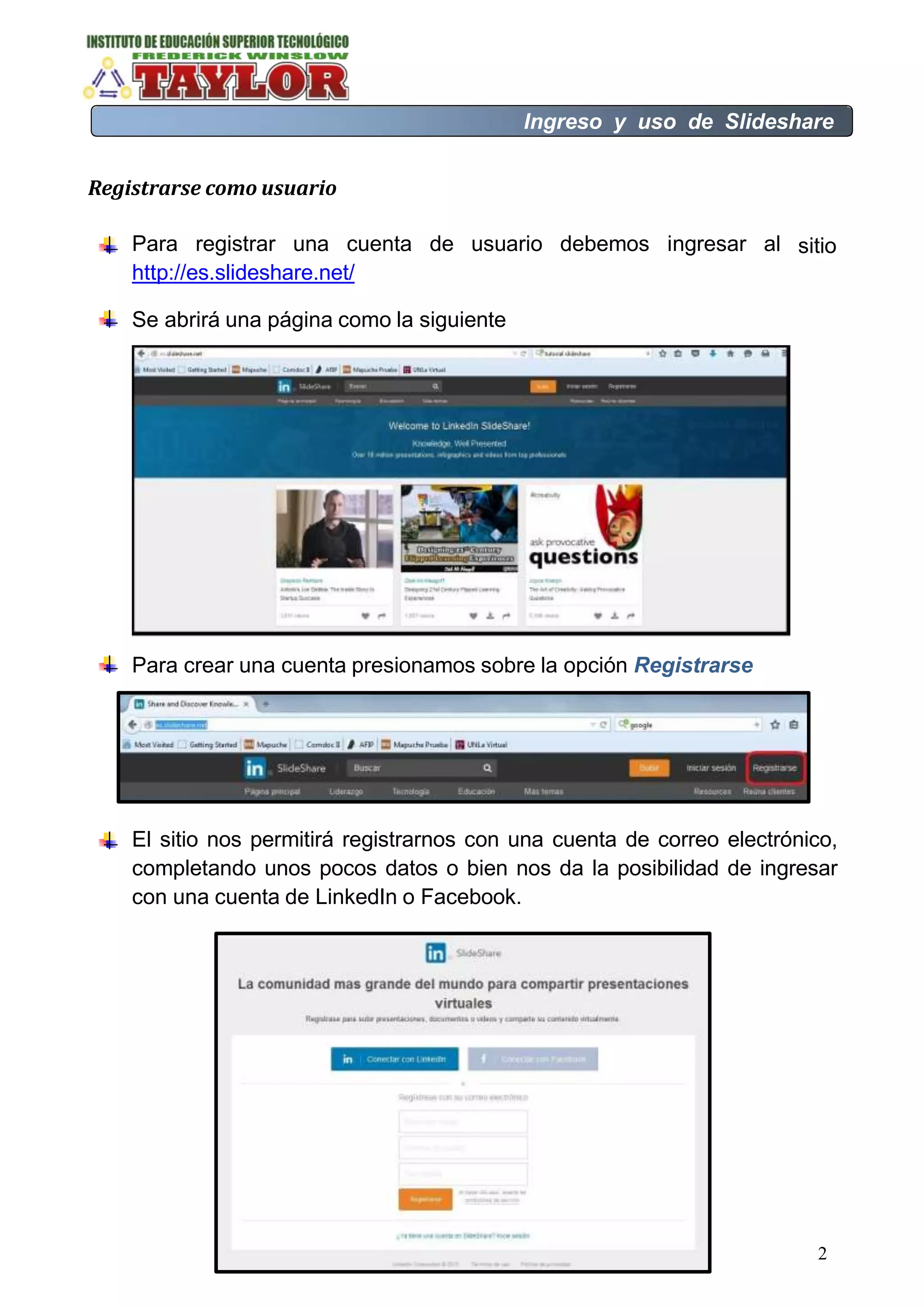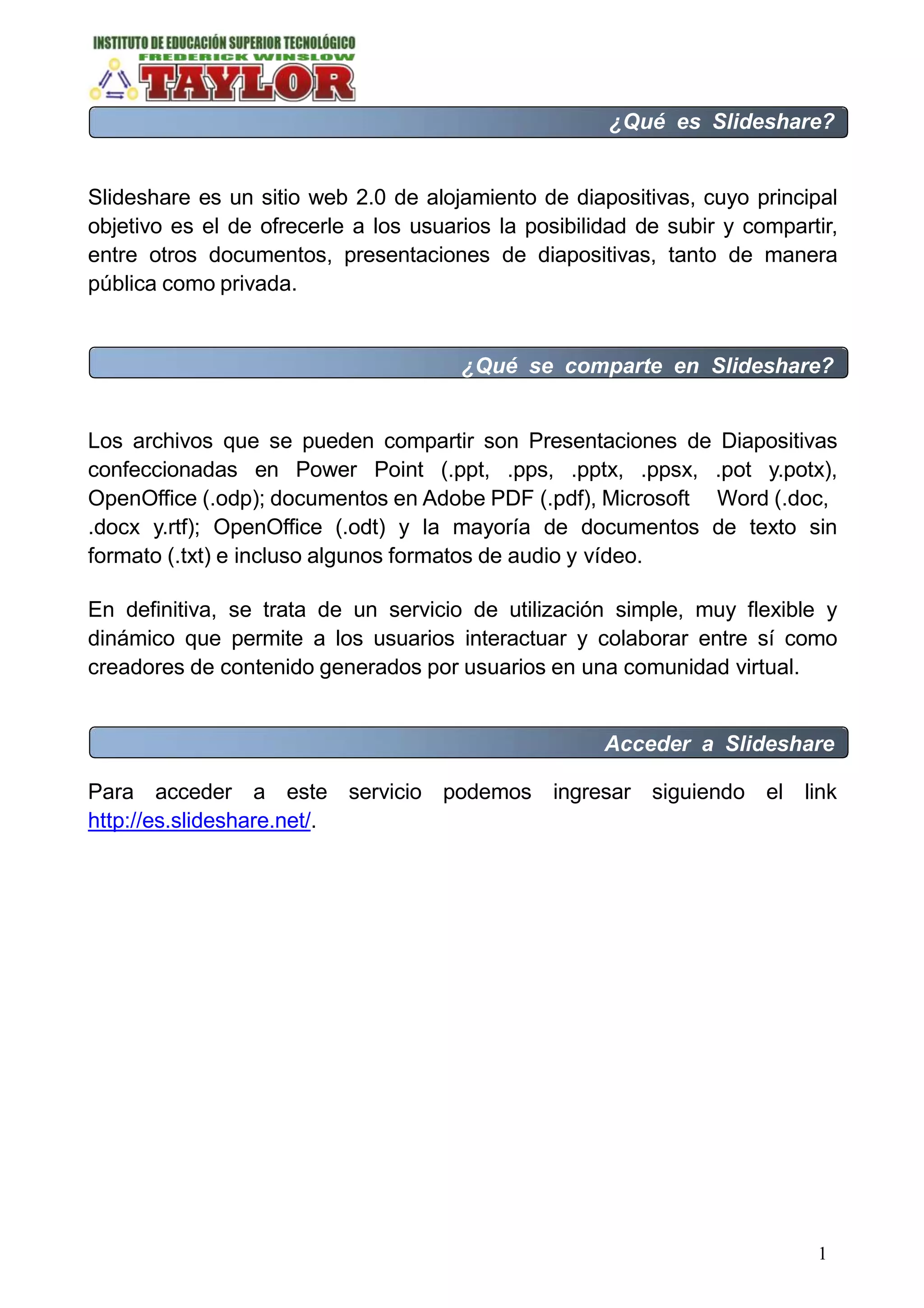 Slideshare es un sitio web que permite a los usuarios subir y compartir presentaciones y documentos de manera pública o privada. Los usuarios pueden registrarse de forma gratuita, buscar y visualizar presentaciones subidas por otros o cargar sus propias presentaciones proveyendo información como título, descripción y categoría. Las presentaciones pueden compartirse de manera pública u optar por mantenerlas privadas.