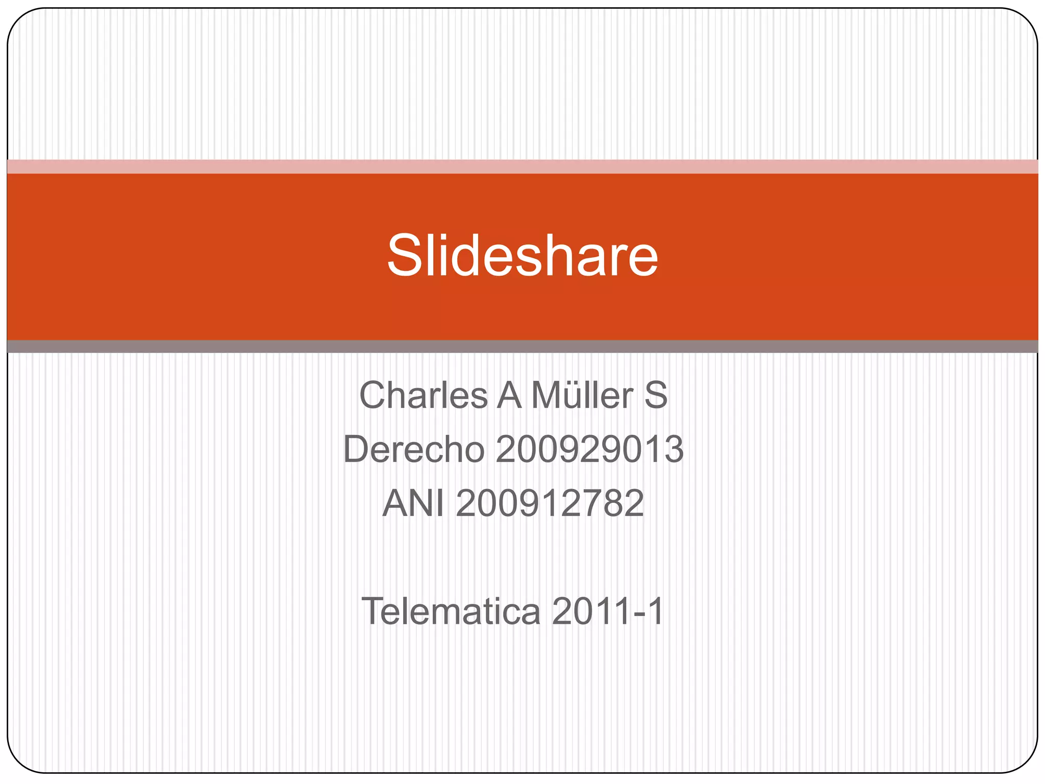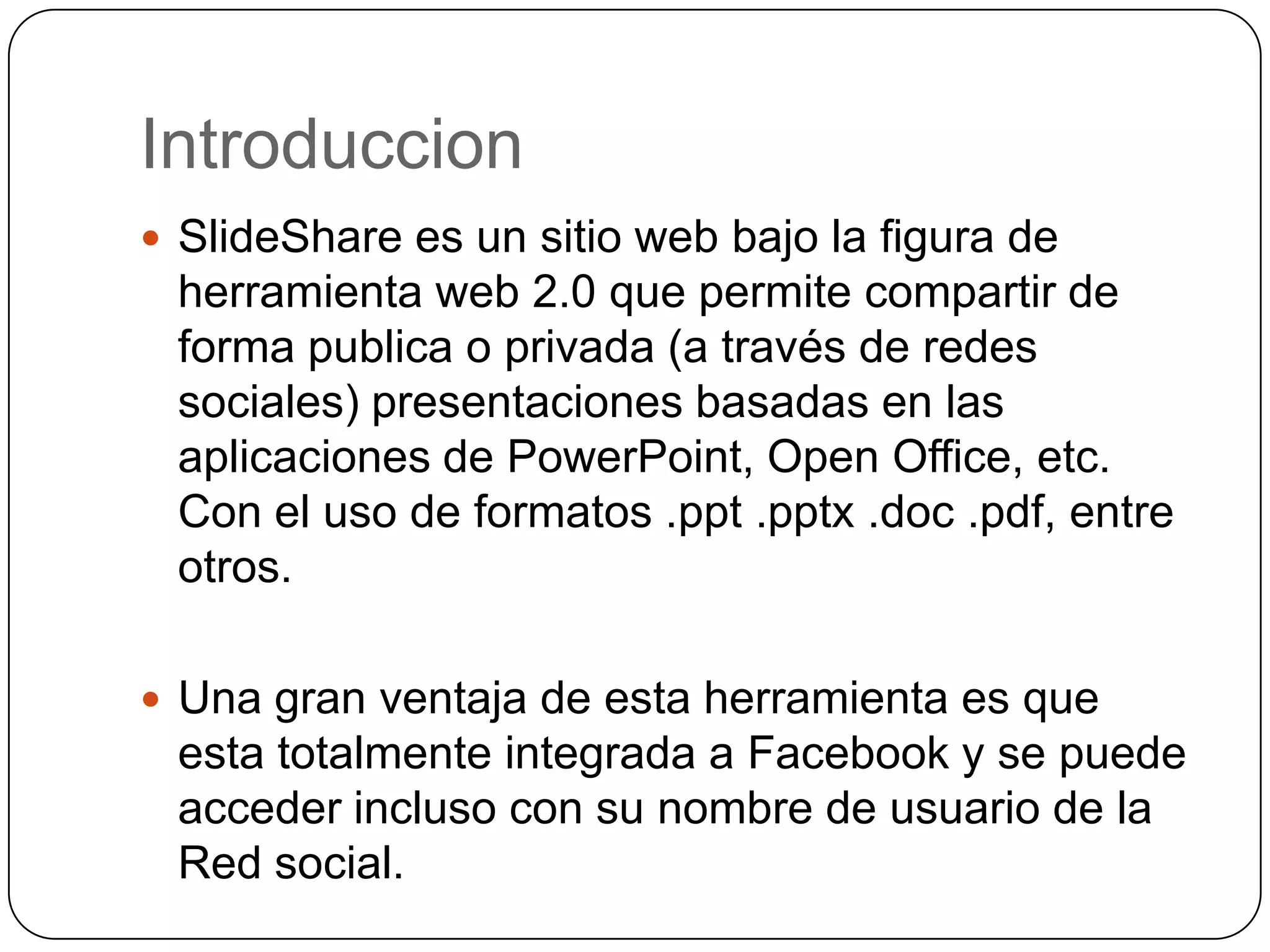 SlideShare es un sitio web que permite compartir presentaciones de PowerPoint u otros formatos de manera pública o privada. Los usuarios pueden subir presentaciones completando un sencillo proceso de registro y carga, y luego describir la presentación con un título, categoría y palabras clave. Una vez publicada, la presentación estará disponible para que otros usuarios la vean directamente en el navegador o la compartan a través de redes sociales.