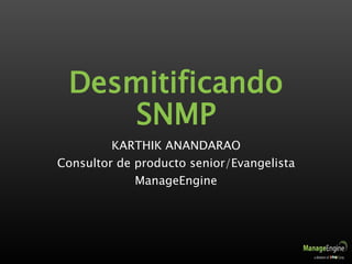 El documento proporciona una guía detallada sobre SNMP (Protocolo Simple de Administración de Red), sus componentes, versiones y herramientas para su implementación y solución de problemas. También se presentan las capacidades de las herramientas de ManageEngine, como el MIB Browser y el SNMP Enabler, que facilitan la administración y monitoreo de dispositivos en redes IP. Finalmente, se destacan aspectos de seguridad y configuraciones necesarias para optimizar el uso de SNMP.