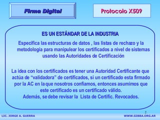El documento presenta una introducción a la firma digital, describiendo los componentes del sistema criptográfico asimétrico, los tipos de certificados digitales, y cómo obtener y utilizar un certificado digital, con énfasis en la normativa legal argentina.