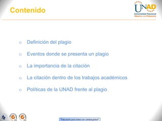 Este documento proporciona una definición de plagio y explica que implica copiar el trabajo de otros sin citar adecuadamente la fuente. Explica que el plagio es inaceptable en el ámbito académico y las consecuencias de ser atrapado cometiendo plagio según las políticas de la UNAD. Además, destaca la importancia de citar correctamente usando parafrases o citas directas y proporciona ejemplos de cómo hacerlo en trabajos académicos.