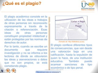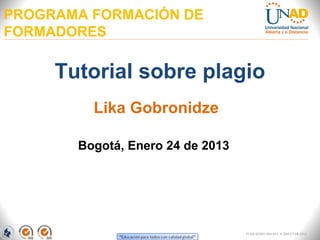 Este documento presenta un tutorial sobre plagio impartido por Lika Gobronidze en Bogotá, Colombia en enero de 2013. Explica que el plagio académico consiste en utilizar las ideas de otros sin darles crédito, y puede tener consecuencias como bajas calificaciones o expulsión. También discute cómo el internet facilita el plagio pero también su detección, y ofrece recomendaciones para citar correctamente y evitar el plagio.