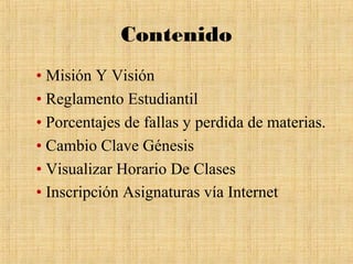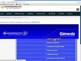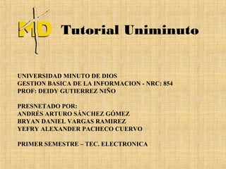 Este documento presenta un tutorial sobre la gestión básica de la información en la Universidad Minuto de Dios. Explica cómo acceder a la misión, visión y reglamento estudiantil de la universidad, ver el horario de clases, cambiar la contraseña en el sistema Génesis e inscribirse en asignaturas de manera virtual.