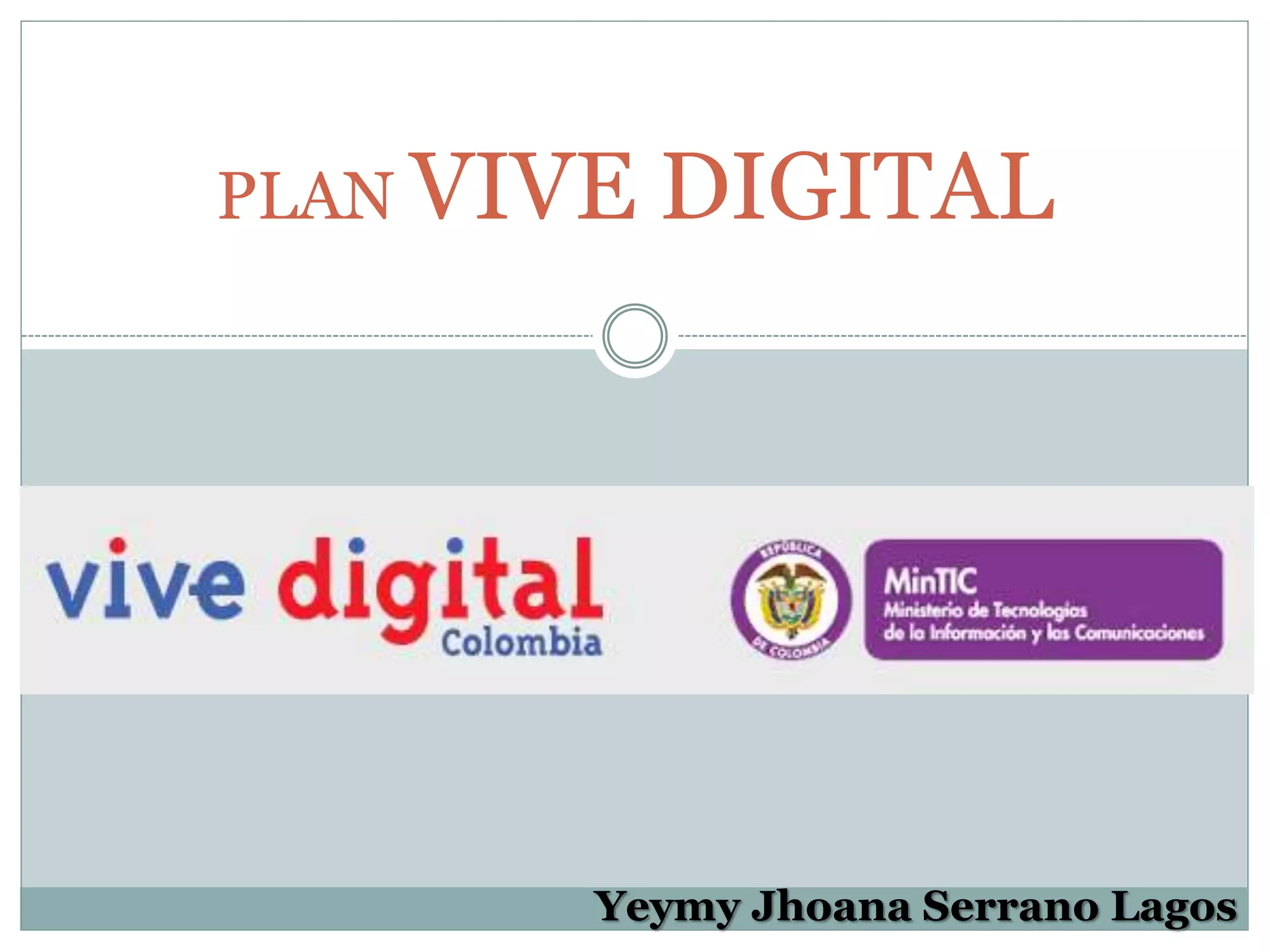 El plan Vive Digital es un plan de cuatro años del gobierno colombiano para masificar el uso de Internet y desarrollar el ecosistema digital del país. El objetivo principal es impulsar la masificación del uso de Internet para promover la prosperidad democrática mediante la creación de empleos TIC, la reducción del desempleo y la pobreza, y el aumento de la competitividad del país. El plan se basa en principios como promover el desarrollo del sector privado, incentivar tanto la oferta como la demanda de servicios digitales, y reducir barreras